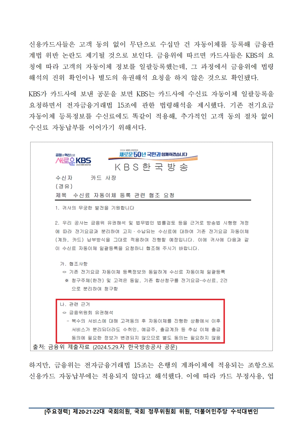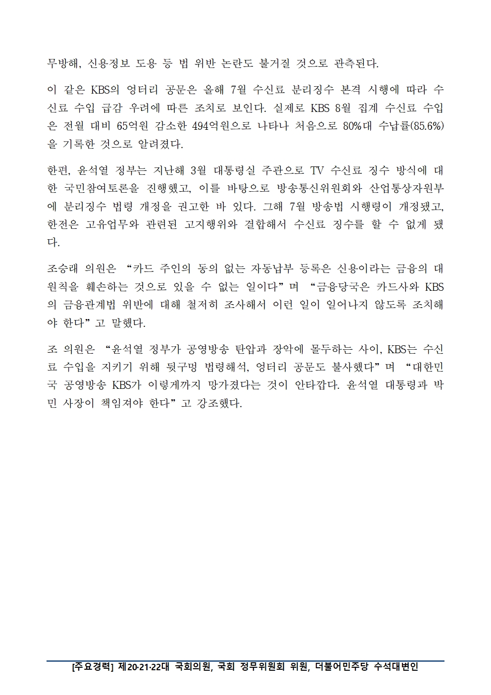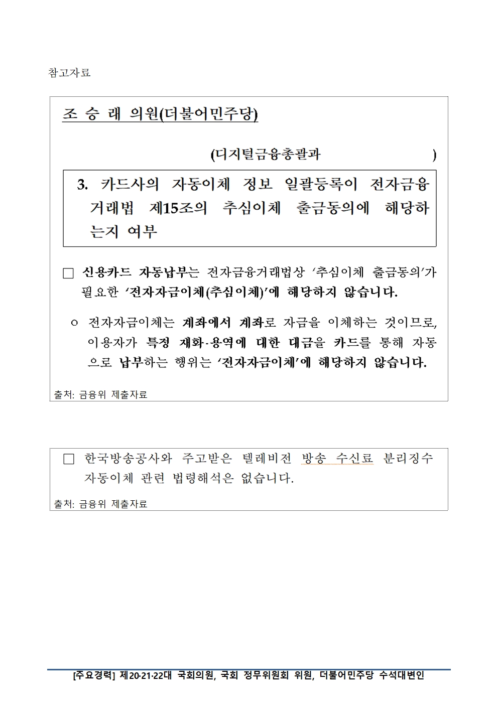 [국회의원 조승래] 신용카드사 TV수신료 자동이체 무단 등록...배경은 KBS의 엉뚱한 법령해석