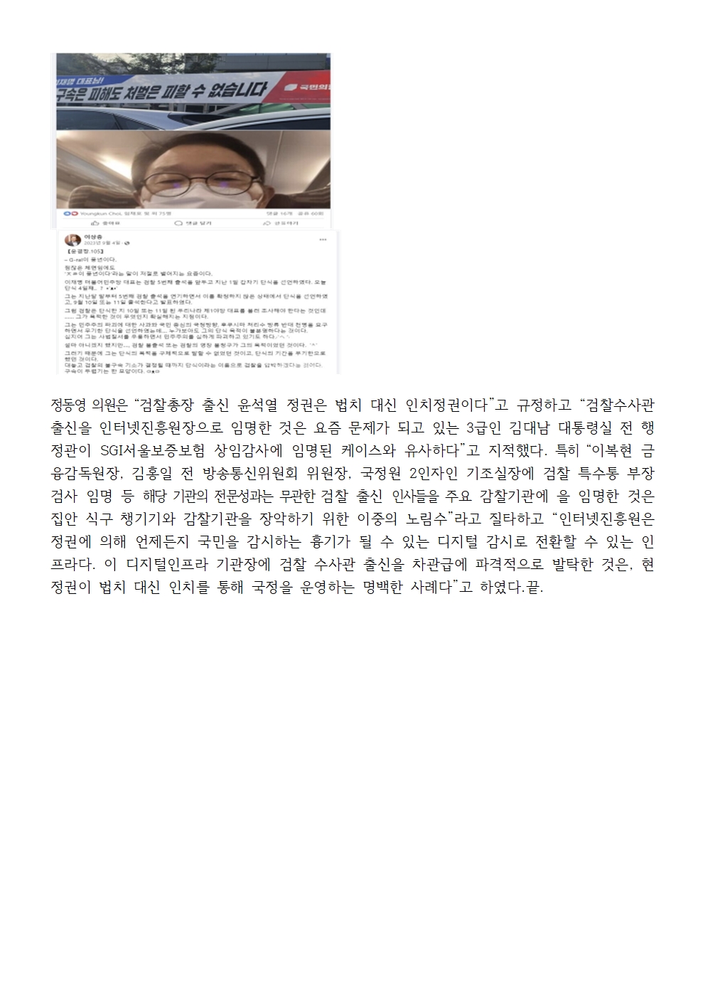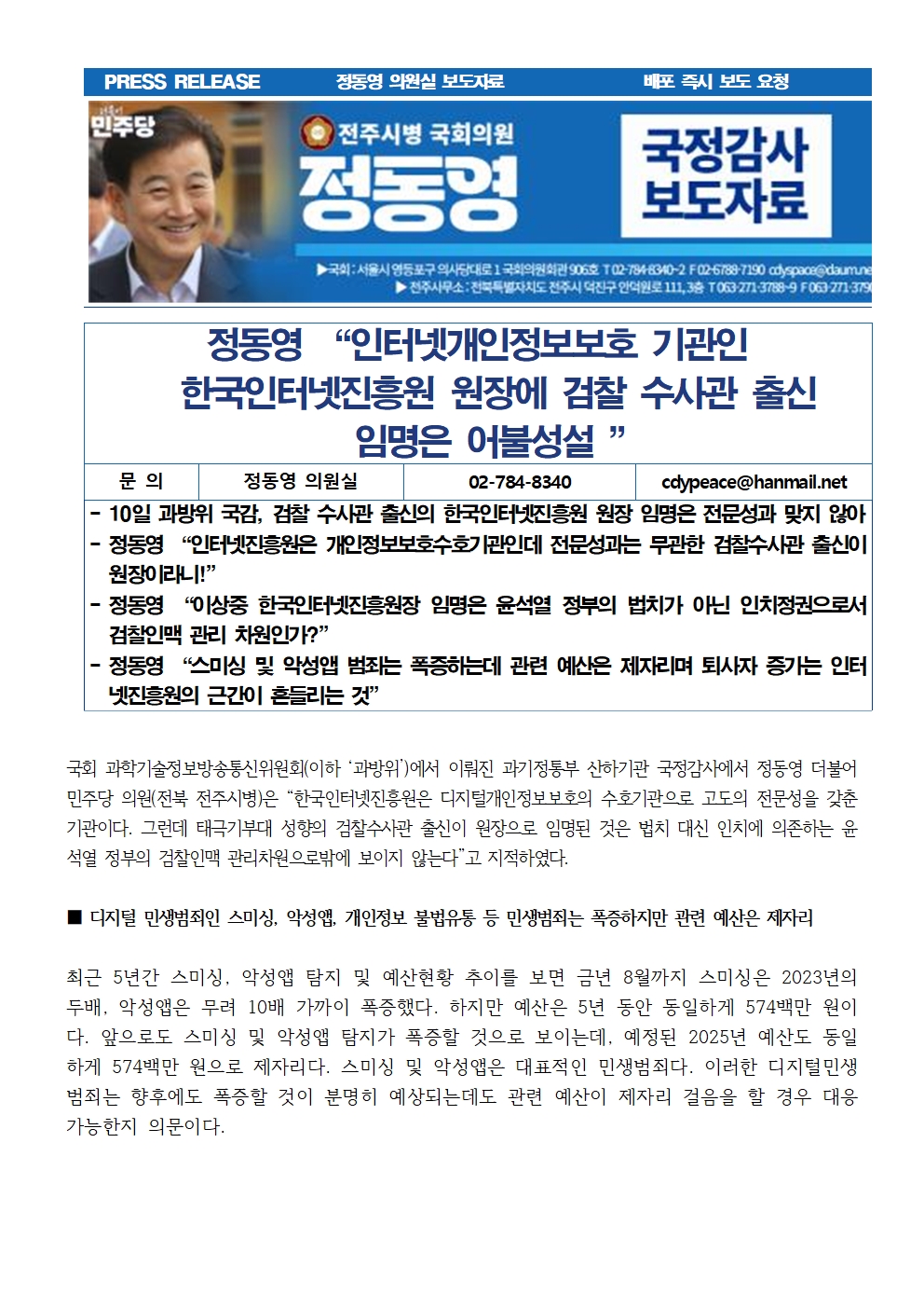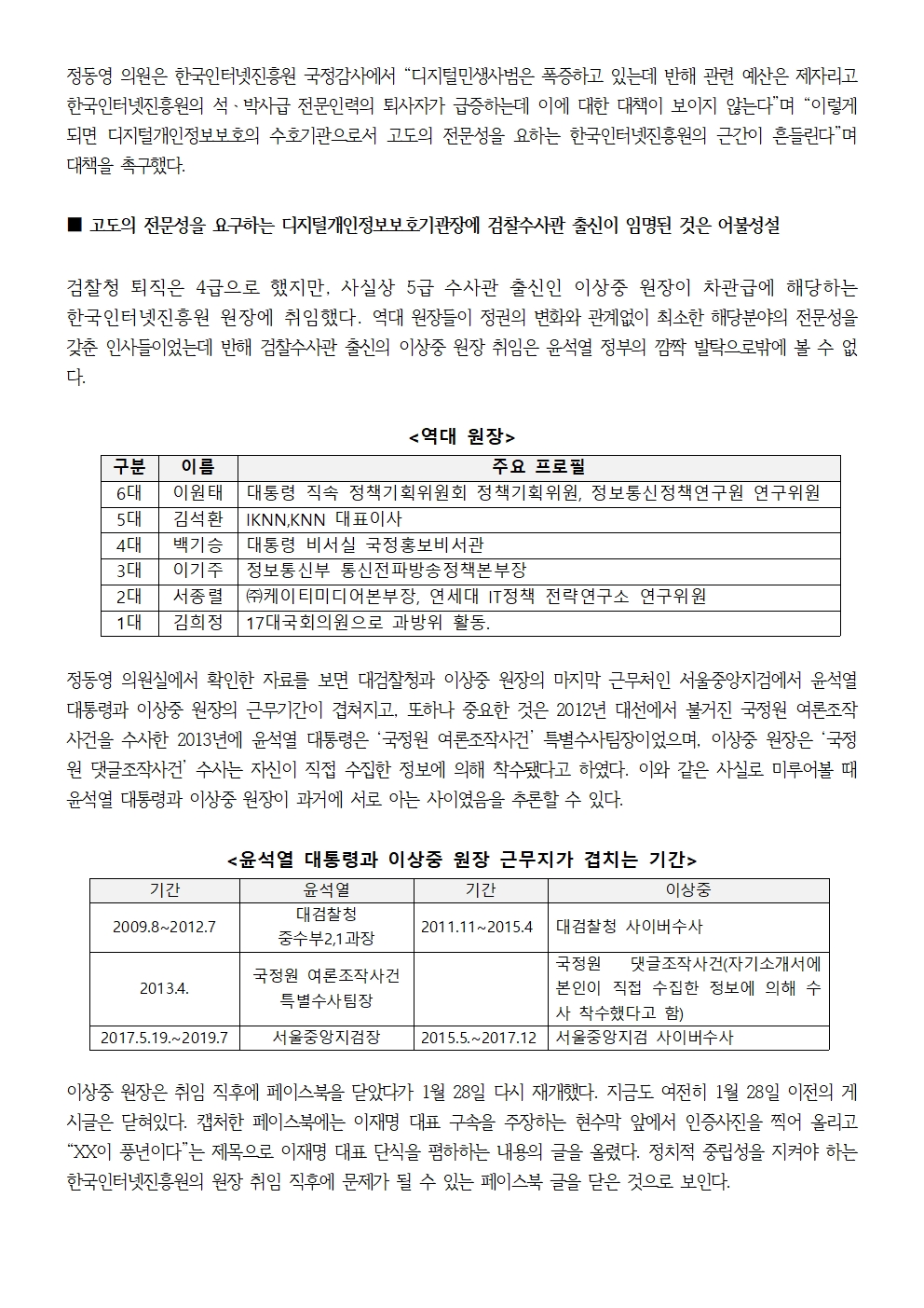 [국회의원 정동영 국감보도자료] 정동영 “인터넷개인정보보호 기관인 한국인터넷진흥원 원장에 검찰 수사관 출신 임명은 어불성설 ”