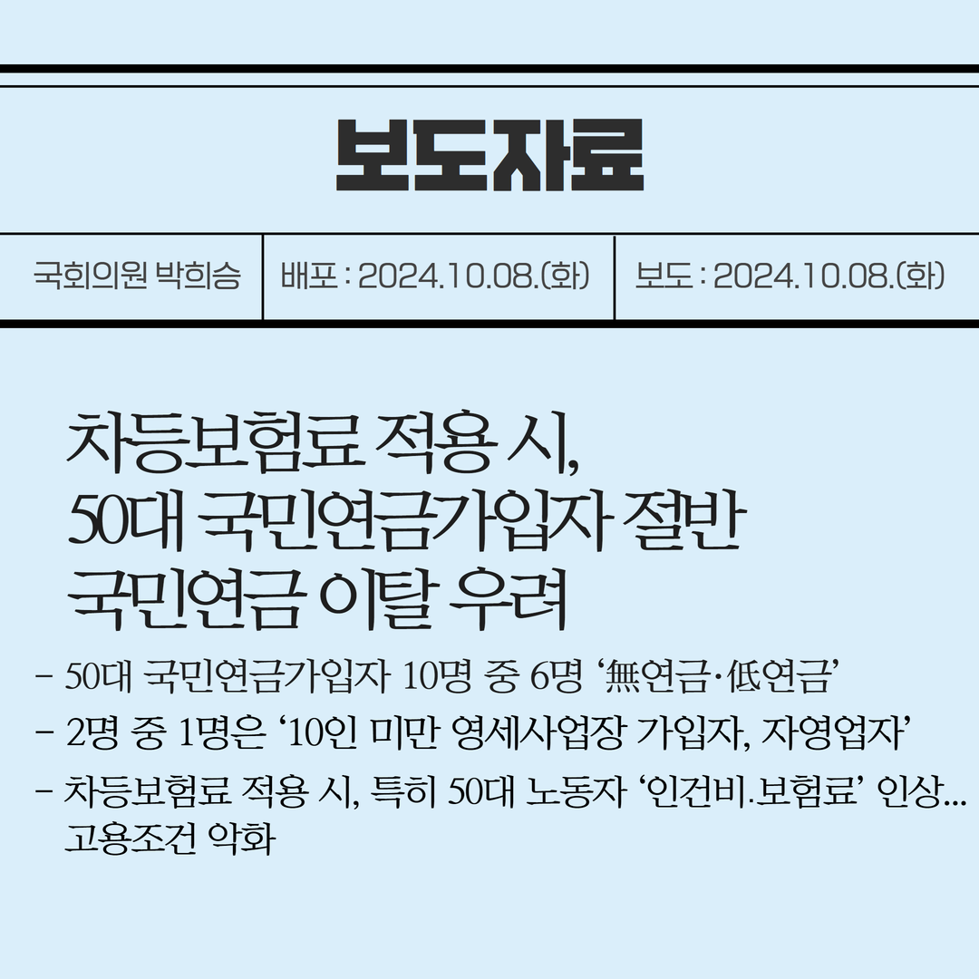 [국회의원 박희승 보도자료] 차등보험료 적용 시, 50대 국민연금가입자 절반 국민연금 이탈 우려