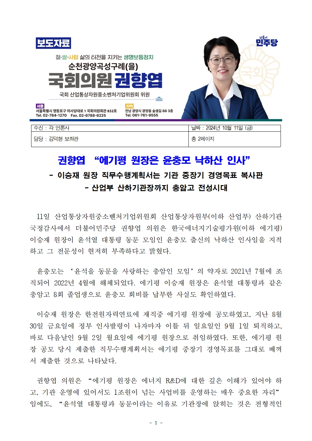[권향엽 국회의원] 241011_에너지기술평가원 윤 대통령 동문 모임인 윤충모 출신 낙하산 기관장_보도자료.hwp
