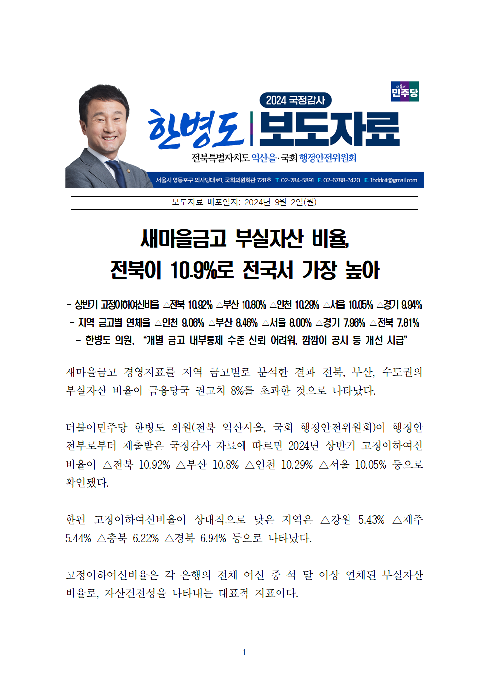 [한병도의원]2024행안위국정감사보도자료(1)_새마을금고 부실자산 비율 전북이 10.9%로 전국서 가장 높아.hwp