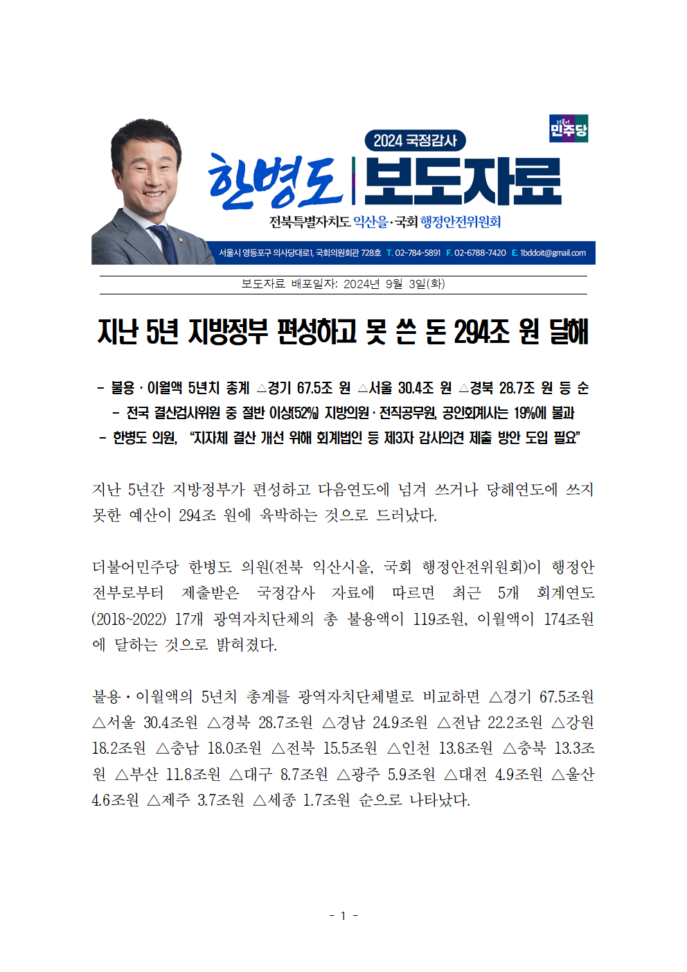 [한병도의원]2024행안위국정감사보도자료(2)_지난 5년 지방정부 편성하고 못 쓴 돈 294조원 달해.hwp