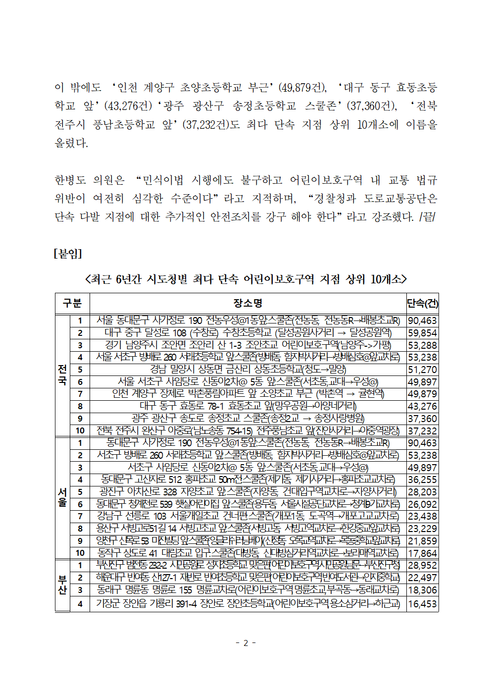 [한병도의원]2024행안위국정감사보도자료(4)_전국 스쿨존 무인단속 최다 단속 지점은 ‘서울 동대문구 배봉초 앞’.hwp