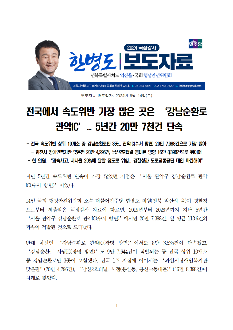 [국회의원 한병도 국정감사] 전국에서 속도위반 가장 많은 곳은 ‘강남순환로 관악IC’... 5년간 20만 7천건 단속