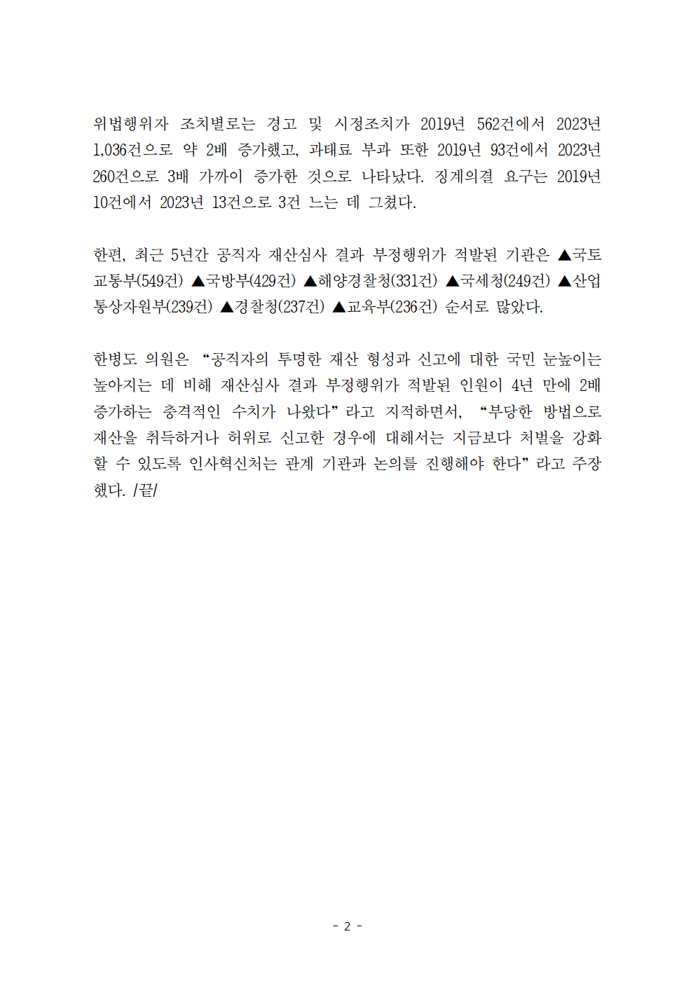 [국회의원 한병도 국정감사] 재산 형성·신고 과정에서 부정행위 적발된 고위공직자, 4년 만에 2배 증가