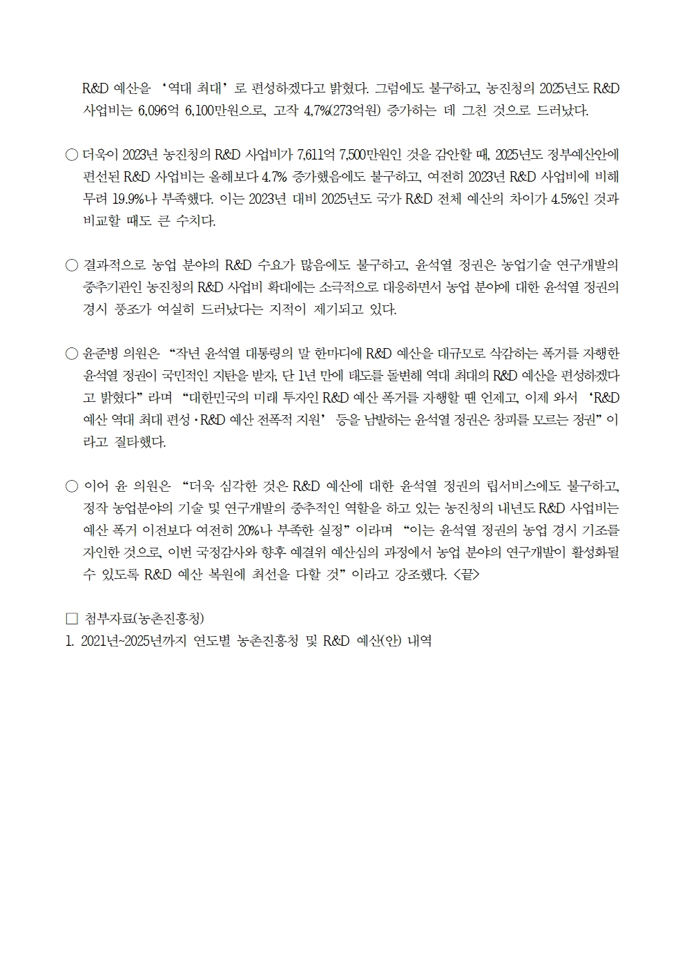 [윤준병 의원 국정감사 보도자료] 윤준병 의원 “내년도 농진청 R&D 사업비_ 23년 대비 여전히 20% 부족”