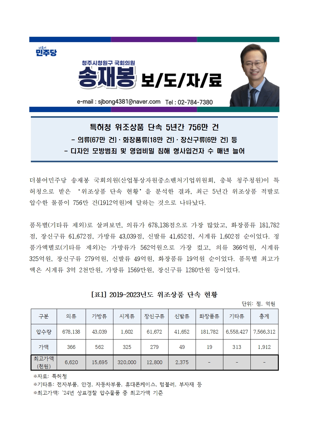 [국회의원 송재봉]특허청 위조상품 단속 5년간 756만 건