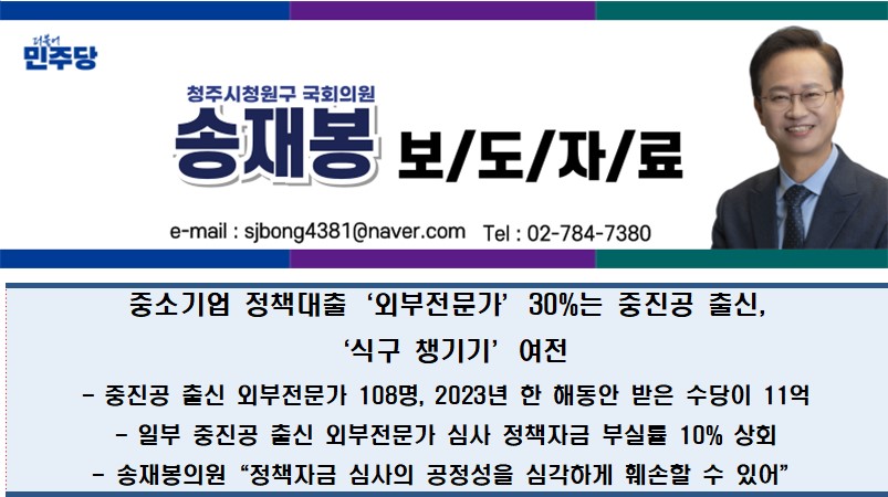 [국회의원 송재봉]중소기업 정책대출‘외부전문가’30%는 중진공 출신, ‘식구 챙기기’여전