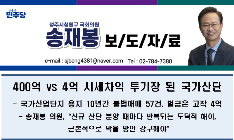 더불어민주당 송재봉 국회의원(산업통상자원중소벤처기업위원회, 충북 청주청원)이 한국산업단지공단(이하 산단공)으로부터 제출받은 국가산단 용지 불법매매 현황을 분석한 결과, 최근 10년간 불법매매로 시세차익 400억 원이 발생했고, 이에 따른 처분내역은 벌금 4억, 징역형이 4건(집행유예 3건)인 것으로 나타났다.