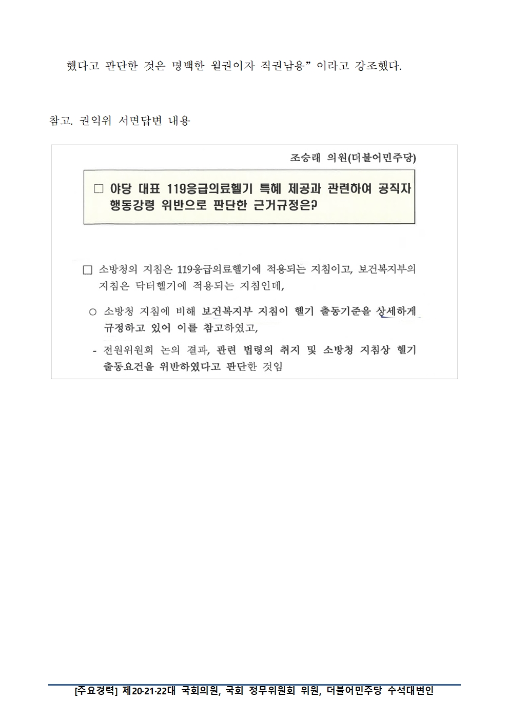 조승래 의원 “닥터헬기 지침 위반이라고 판단한 적 없다”는 권익위 해명 반박.hwp