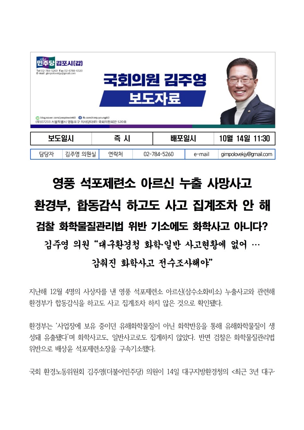 [국회의원 김주영] 영풍 석포제련소 아르신 누출 사망사고, 환경부 합동감식 하고도 사고 집계조차 안 해 - 검찰 화학물질관리법 위반 기소에도 화학사고 아니다?