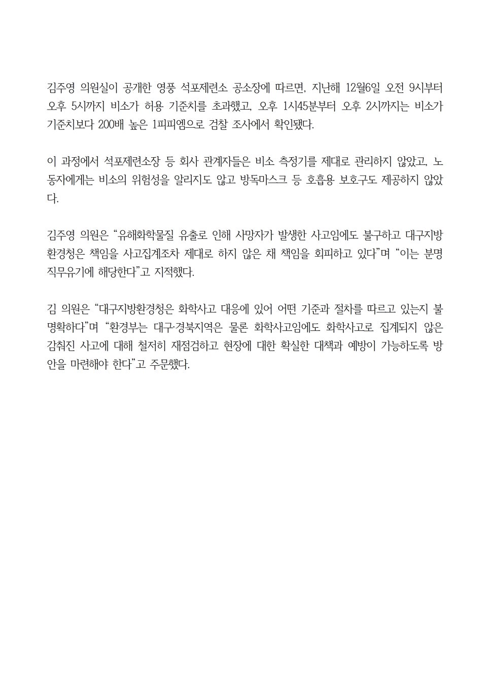 국회 환경노동위원회 김주영(더불어민주당) 의원이 14일 대구지방환경청의 <최근 3년 대구·경북지역 화학사고 및 일반사고 집계현황>을 확인한 결과 영풍 석포제련소 아르신 누출사고가 누락돼 있는 것을 확인했다.