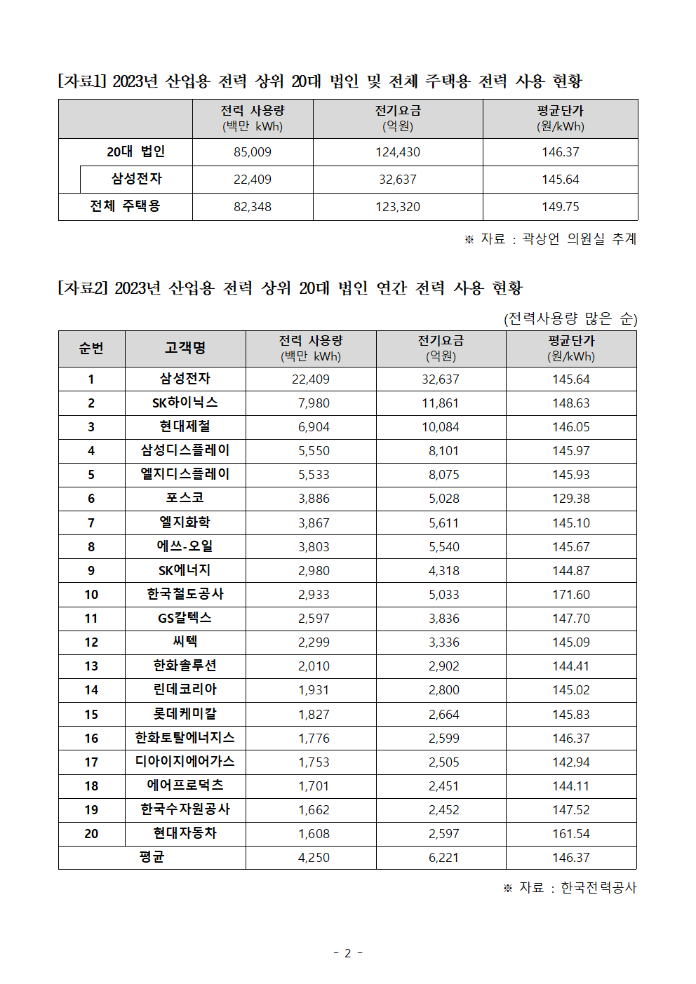 [국회의원 곽상언] 상위 20대 전력다소비 대기업 전력 사용량, 전 국민 주택용 전력 사용량과 맞먹어