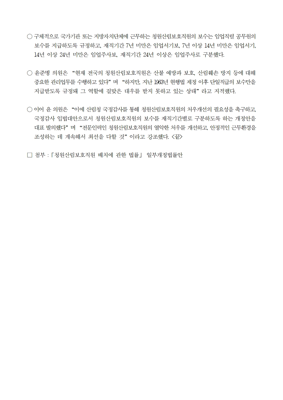 241016 [윤준병 의원 국정감사 보도자료] 윤준병 의원 국정감사 대안 ‘청원산림보호직원 처우개선법’ 발의.hwp