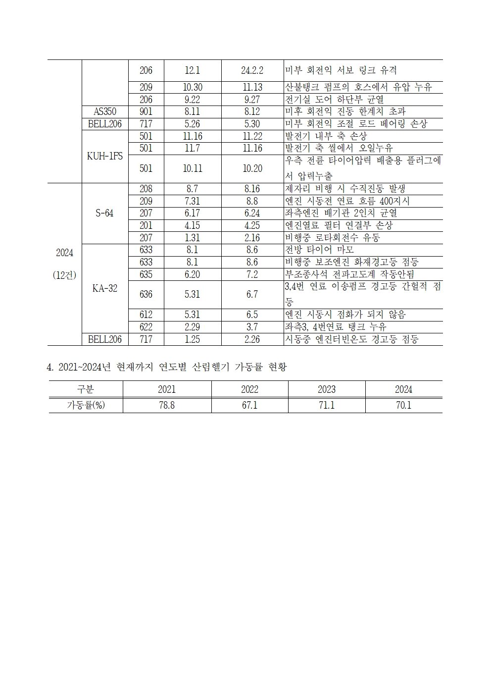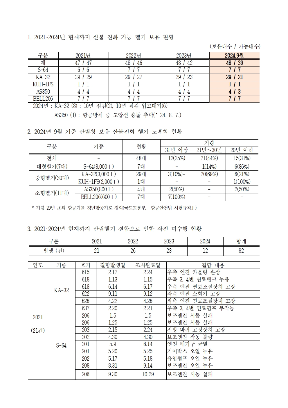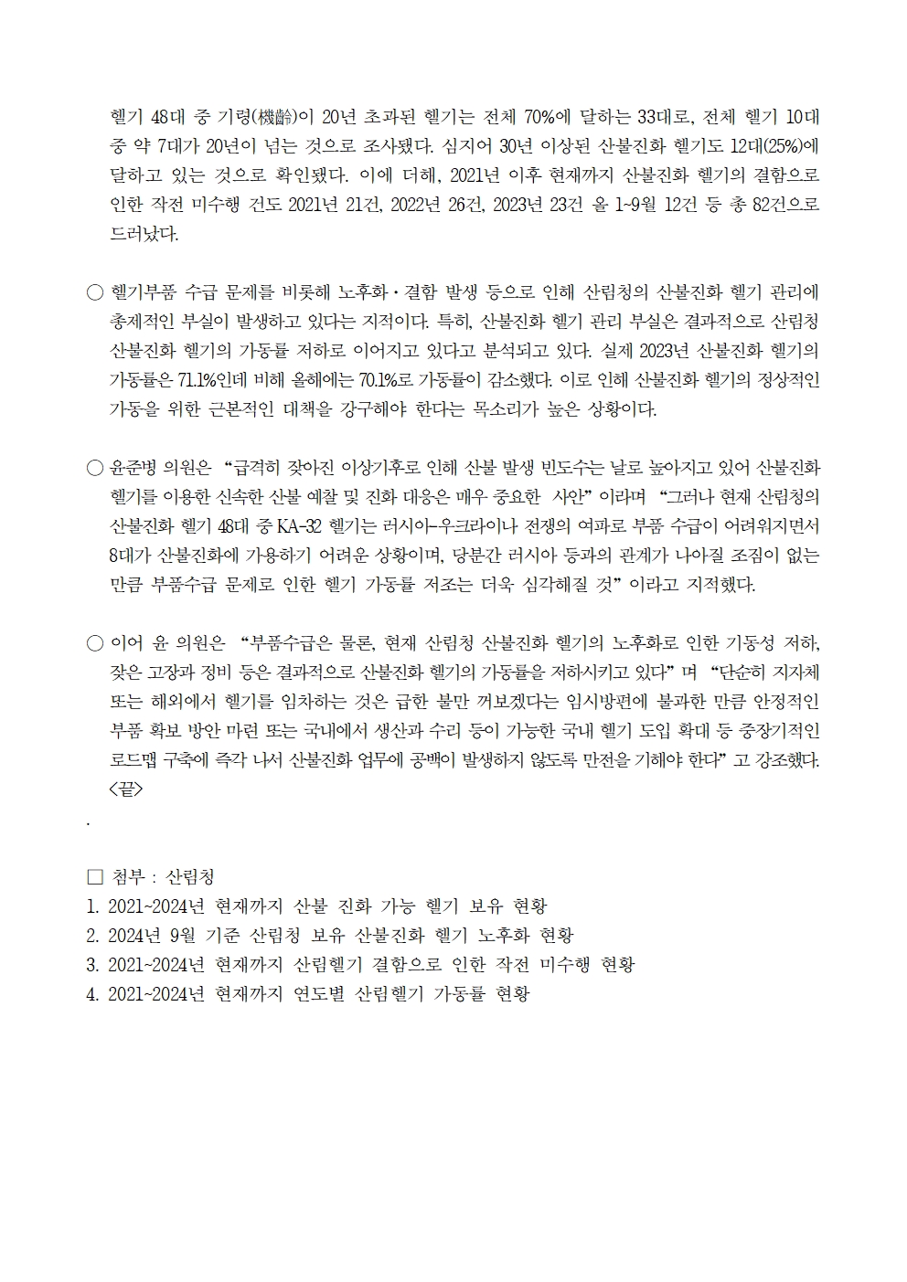[윤준병 의원 국정감사 보도자료] 헬기 부품수급 부족·결함 발생·노후화 등 산림청 헬기 관리 총체적 부실