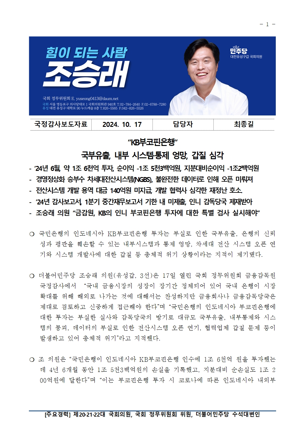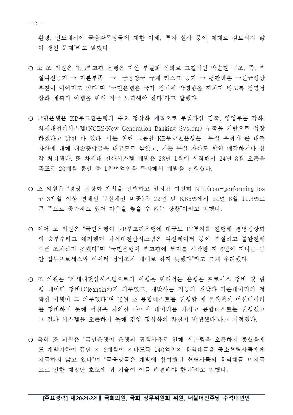 [국회의원 조승래] "KB부코핀은행" 국부유출, 내부 시스템·통제 엉망, 갑질 심각