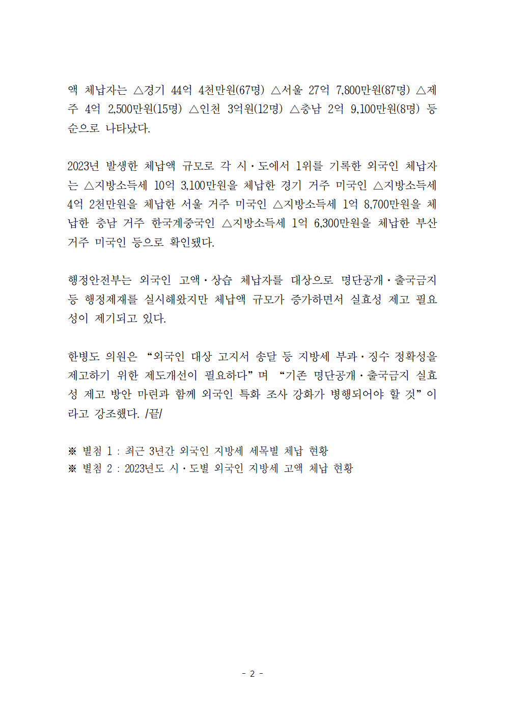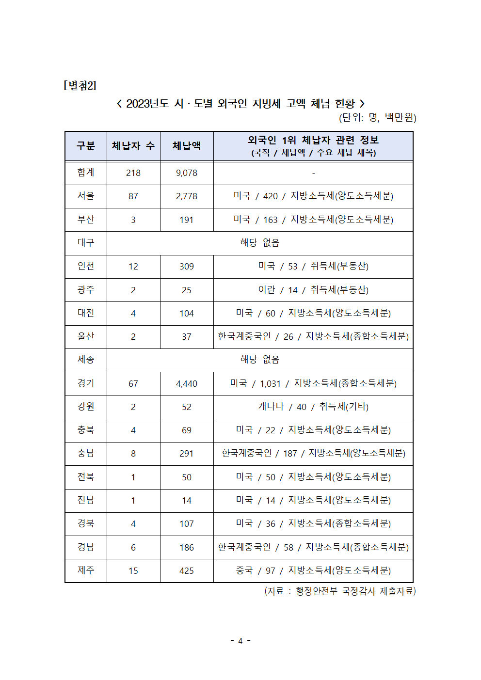 [한병도의원]2024행안위국정감사보도자료(26)_외국인 지방세 체납액 4백억원 넘어... 지방소득세 10억 안 낸 미국인 체납자도.hwp