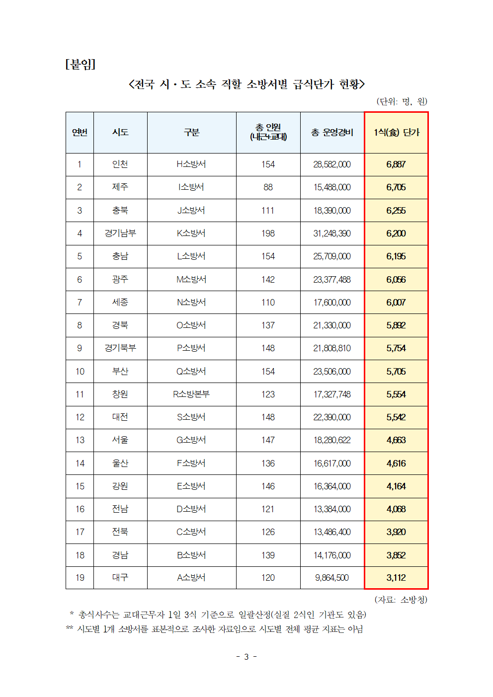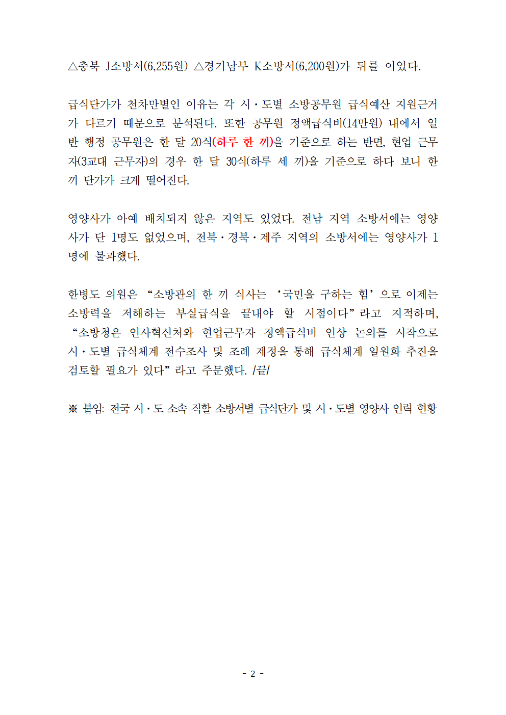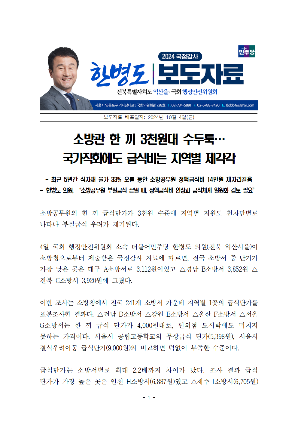 [한병도의원]2024행안위국정감사보도자료(27)소방관 한 끼 3천원대 수두룩…국가직화에도 급식비는 지역별 제각각.hwp