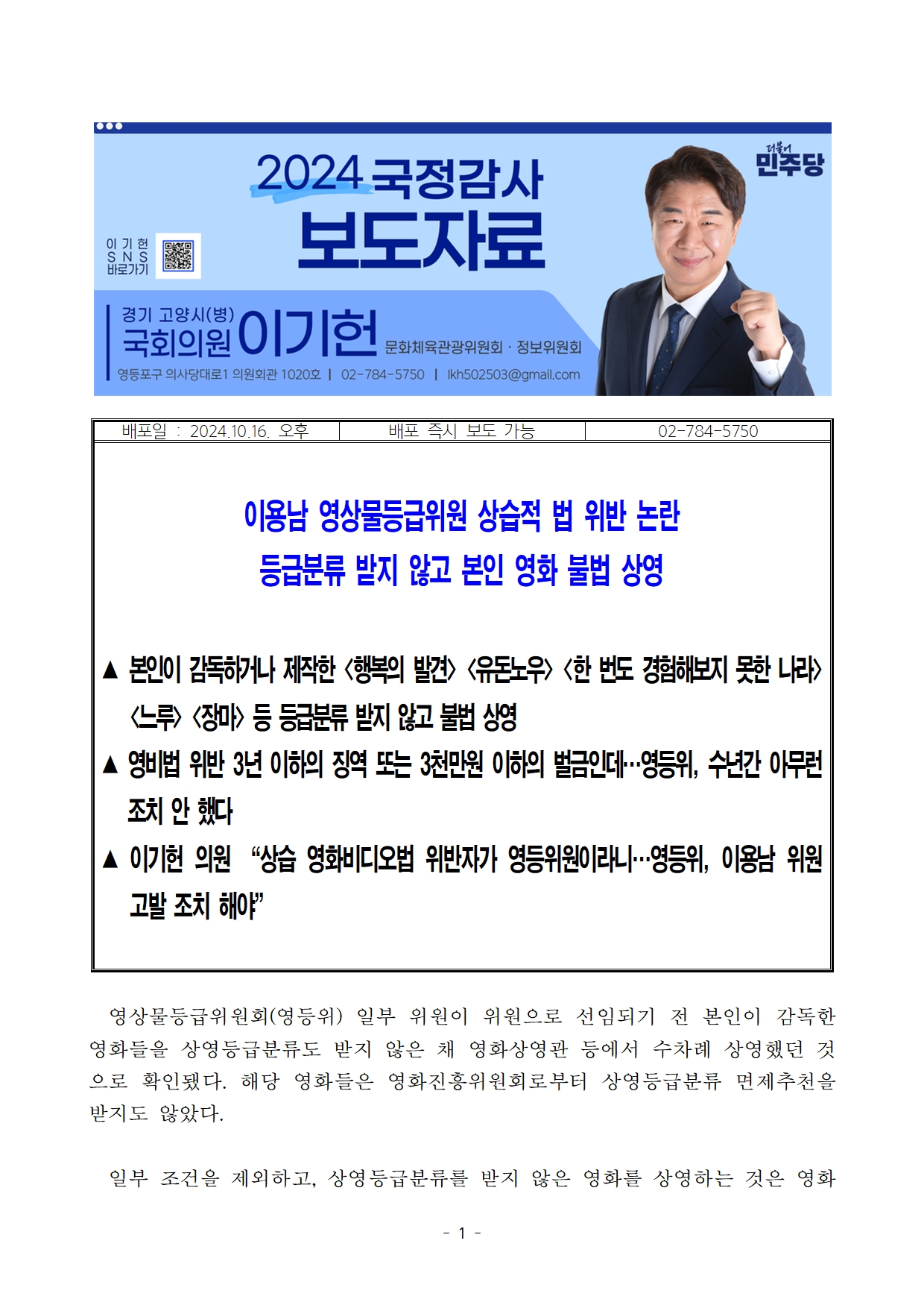 [이기헌 의원(고양시 병) 보도자료]이용남 영상물등급위원 상습적 법 위반 논란