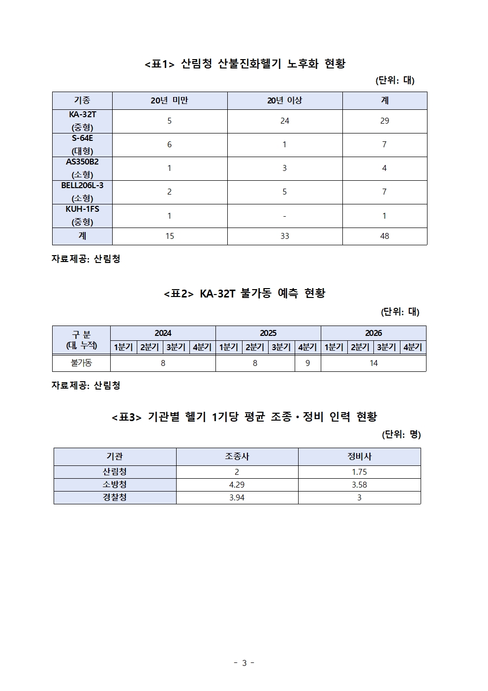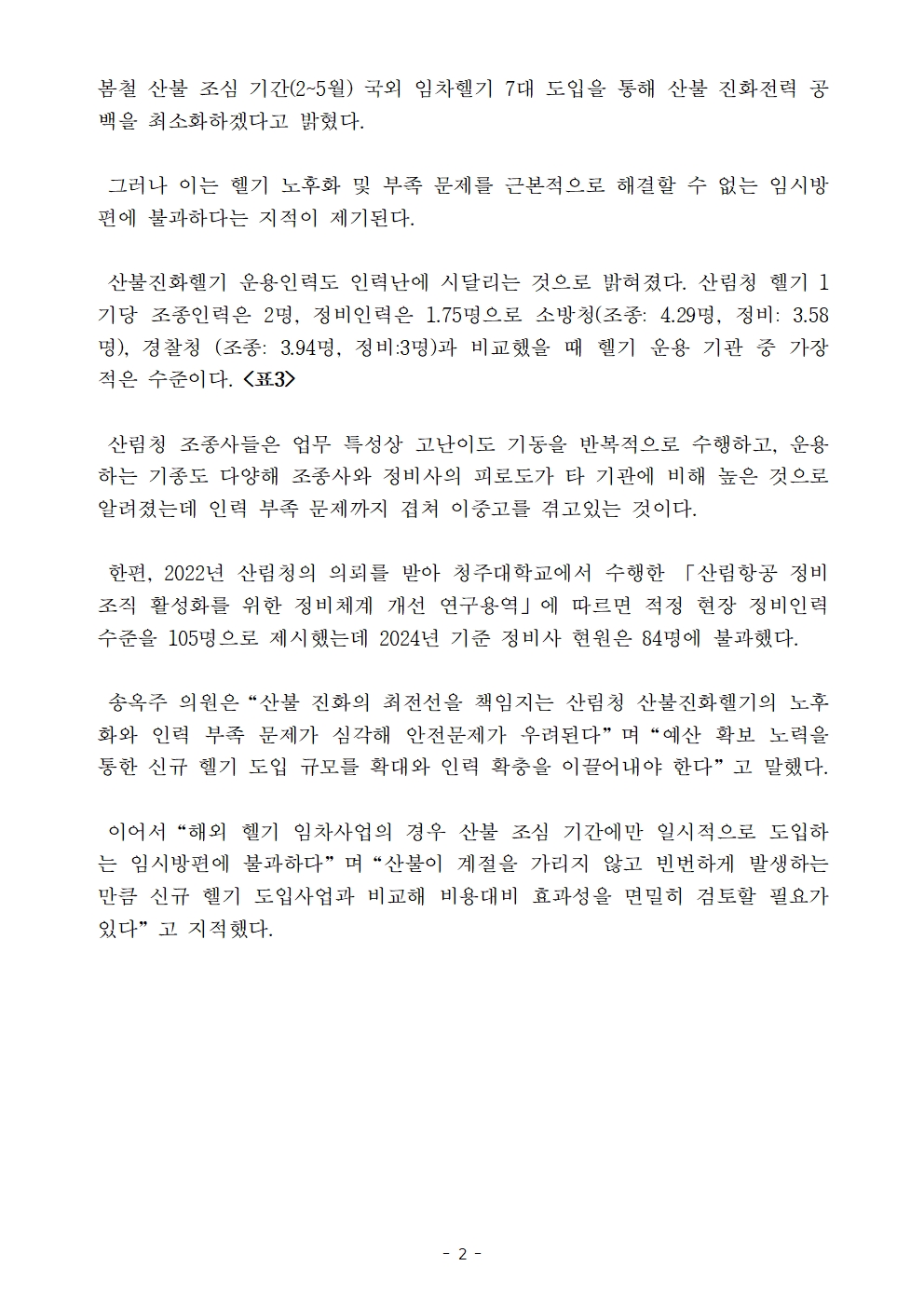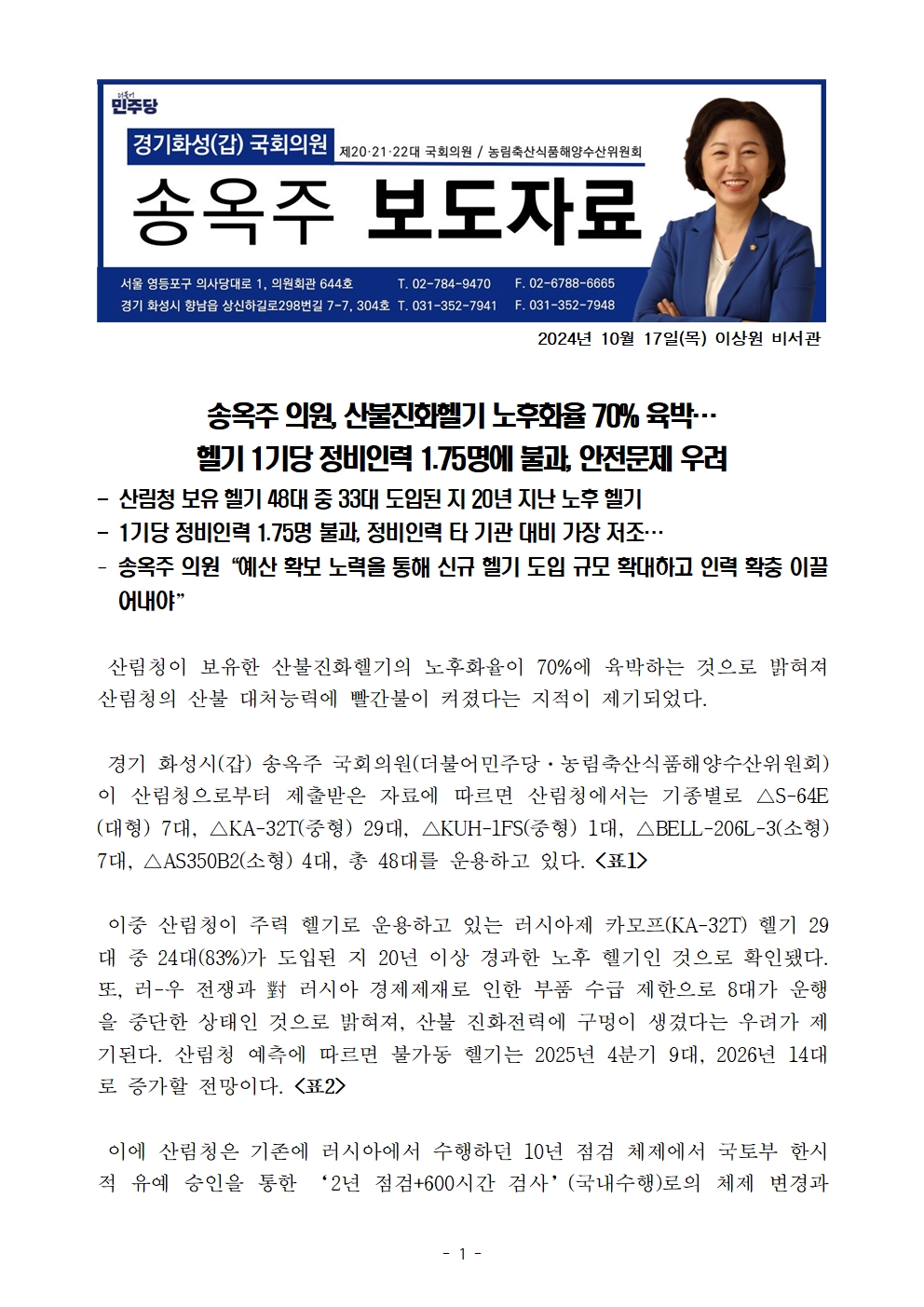 보도자료_송옥주의원실_산불진화헬기 노후화율 70% 육박…헬기 1기당 정비인력 1.75명에 불과 안전문제 우려 .hwp