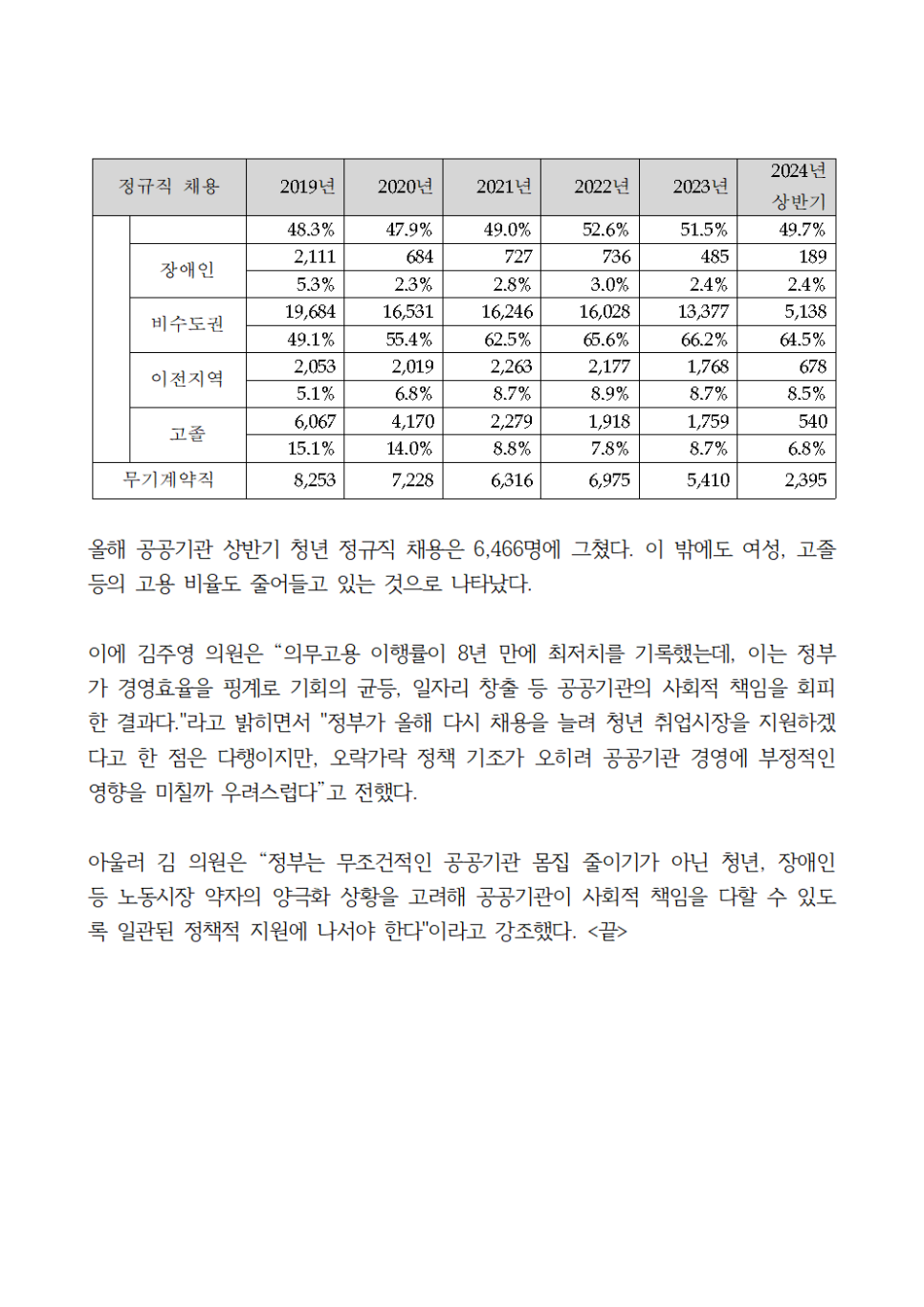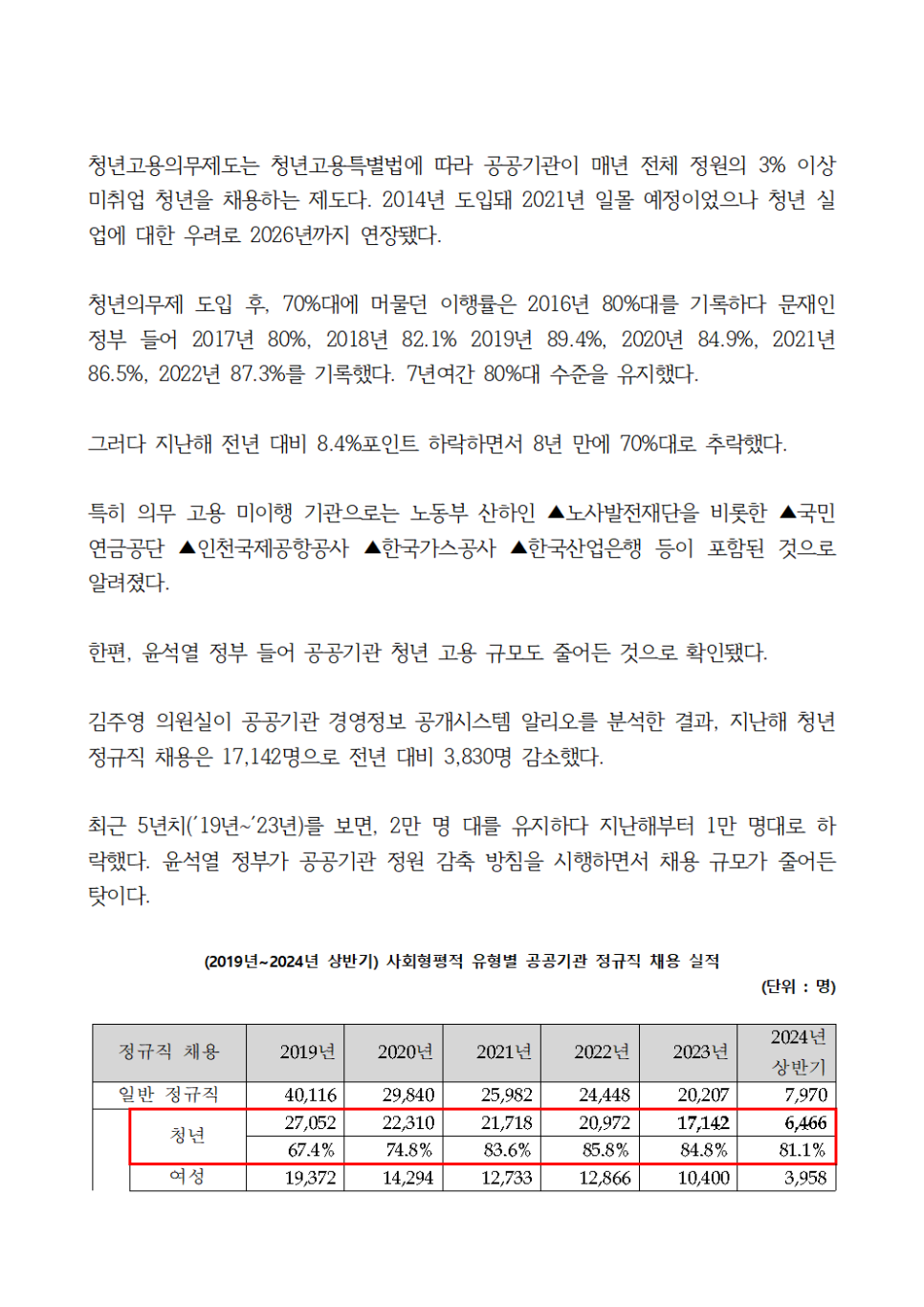 [국회의원 김주영] 청년의무고용률 8년 만에 70%대 추락 공공부문 청년 정규직 채용 규모도 尹 정부 들어 2만 명대 →1만 명대 하락
