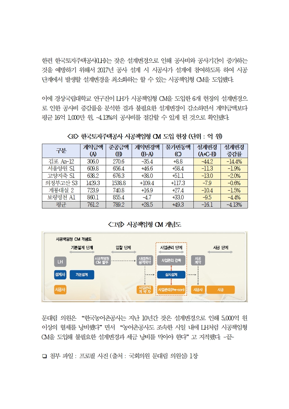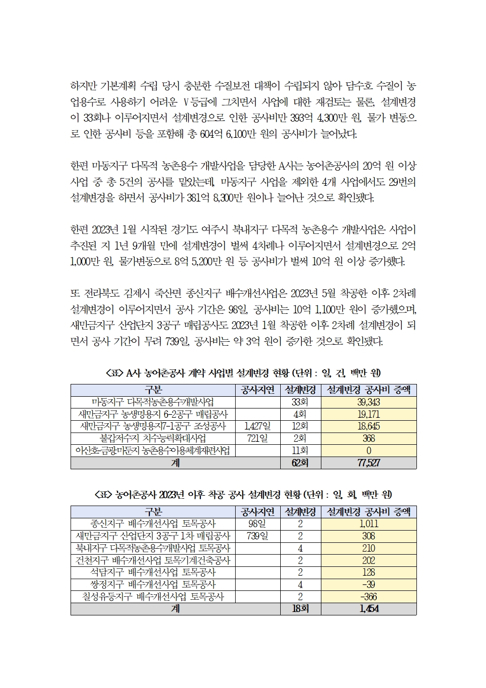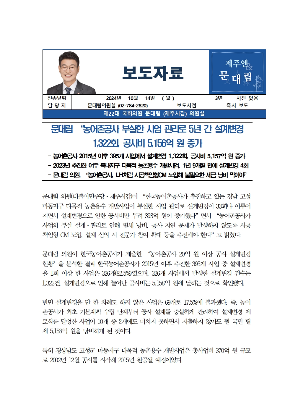 [국회의원 문대림] 농어촌공사 부실한 사업 관리로 5년 간 설계변경 1,322회, 공사비 5,156억 원 증가