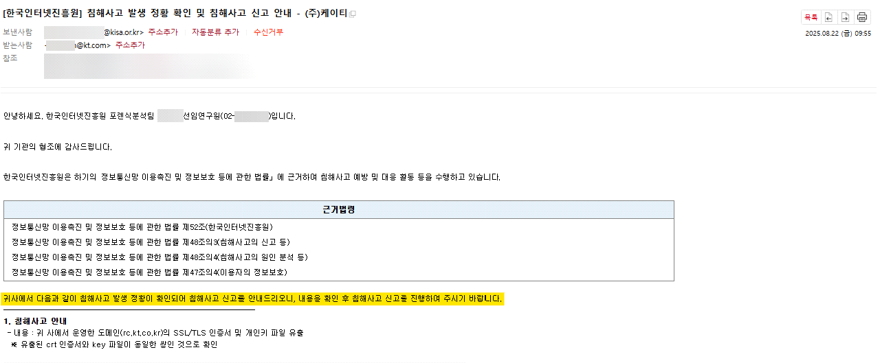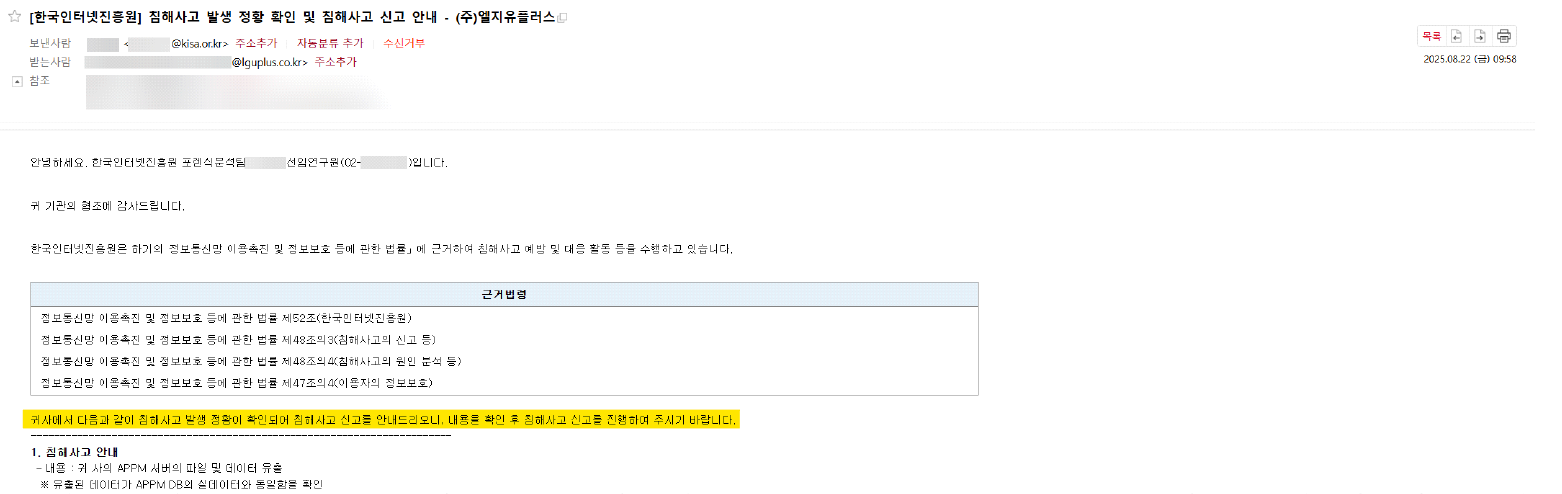 [참고] KISA가 8월 22일 KT와 LGU+에 ‘데이터 유출이 확인되었으니, 침해신고 하라’ 발송한 공문