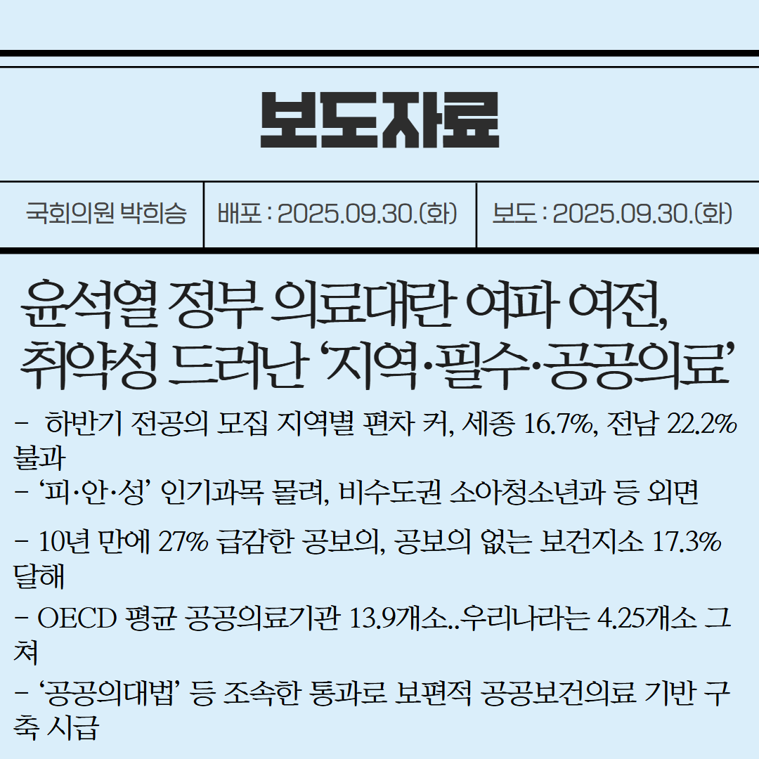 [국회의원 박희승 보도자료] 윤석열 정부 의료대란 여파 여전, 취약성 드러난 ‘지역·필수·공공의료’