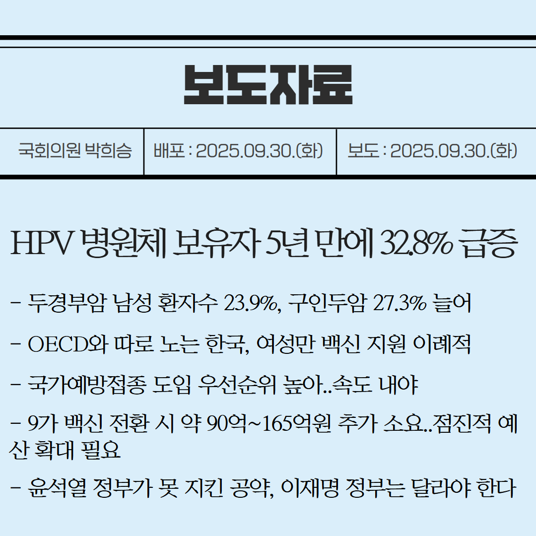 [국회의원 박희승 보도자료] HPV 병원체 보유자 5년 만에 32.8% 급증