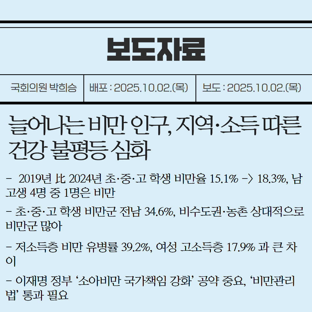 [국회의원 박희승 보도자료] 늘어나는 비만 인구, 지역·소득 따른 건강 불평등 심화