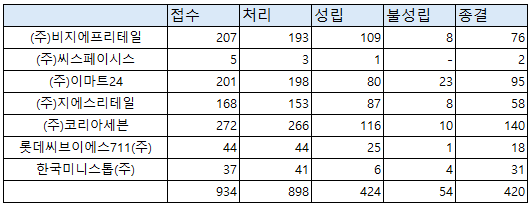 불공정거래 분쟁조정 처리 현황을 살펴보면, 최근 5년간 총 898건이 처리됐으며 이 중 424건(47.2%)이 불공정거래행위로 성립됐다. ㈜코리아세븐이 115건으로 가장 많았고, ㈜비지에프리테일 109건, ㈜지에스리테일 87건, ㈜이마트24 80건 순이었다.