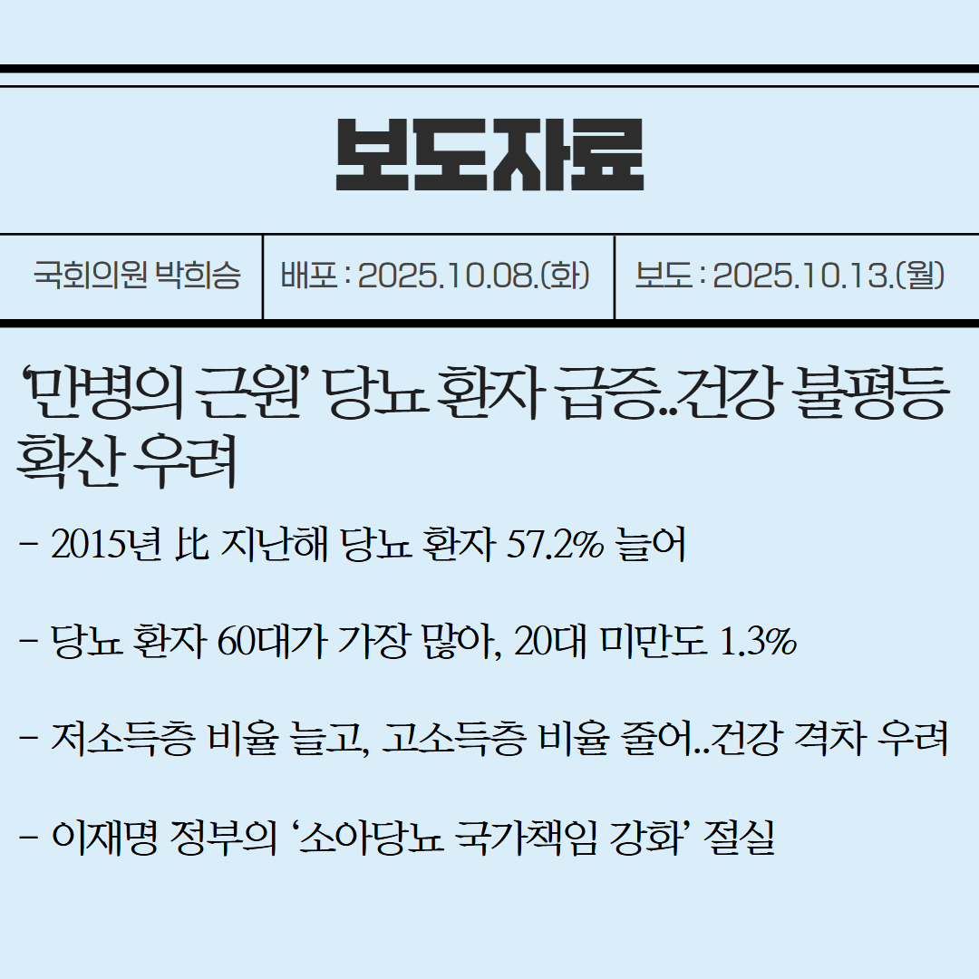 [국회의원 박희승 보도자료] ‘만병의 근원’ 당뇨 환자 급증..건강 불평등 확산 우려