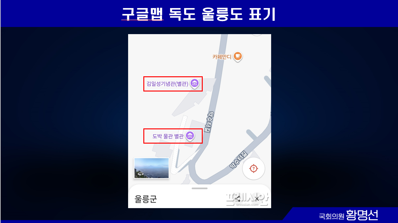 황명선 의원은 국외로 정밀 지도가 반출될 경우, 위기 시 대응·통제 능력이 사실상 불가능하다는 점을 지적했다. 실제로 구글맵은 지난달 ‘독도 박물관(본관)’을 ‘김일성기념관(별관)’으로, ‘독도박물관(별관)’은 ‘도박 물관 별관’으로 표기했고, 이를 수정하는 데 약 4시간이 소요됐다.