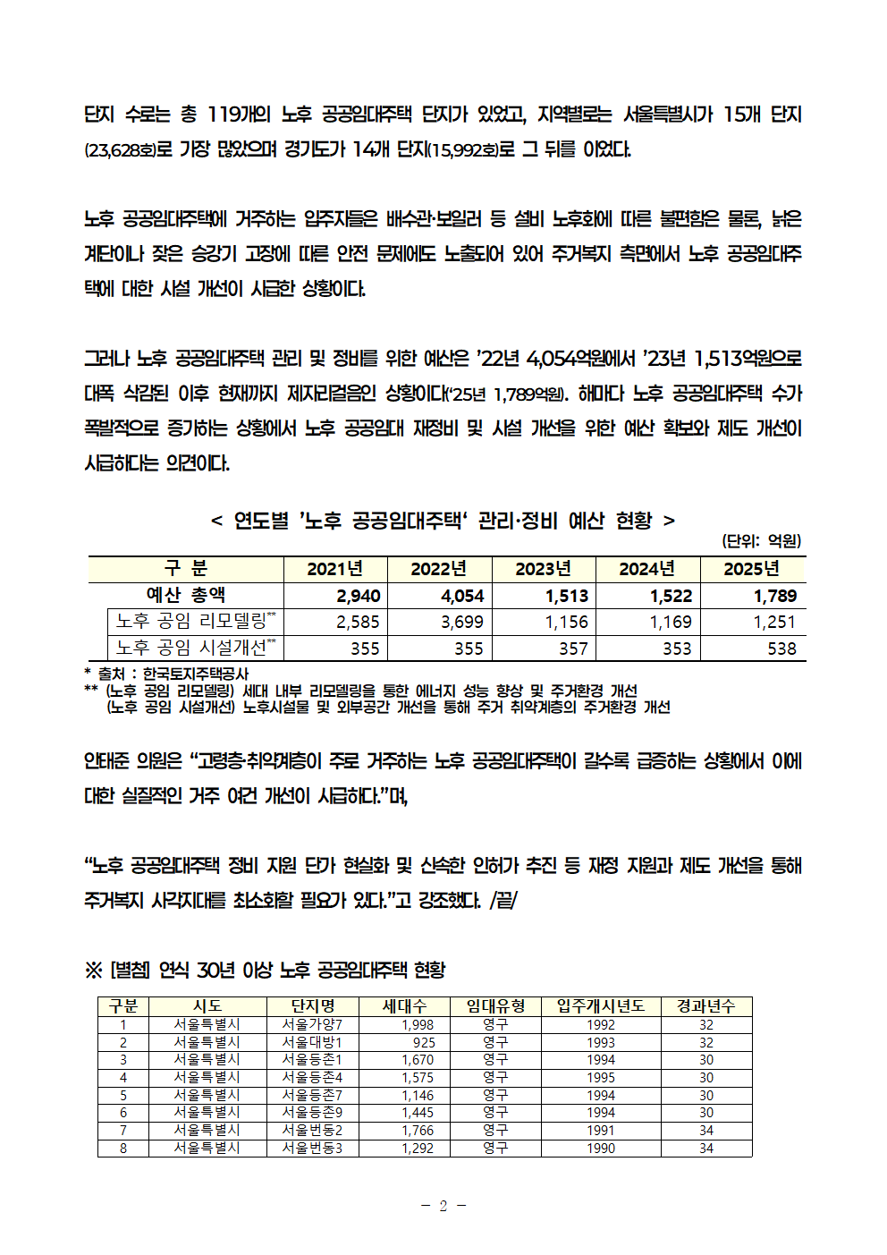 251014 (안태준 의원 보도자료) 1. 30년 이상 노후 공공임대 13만 8천호 5년 전에 비해 11배 이상 급증!.hwp