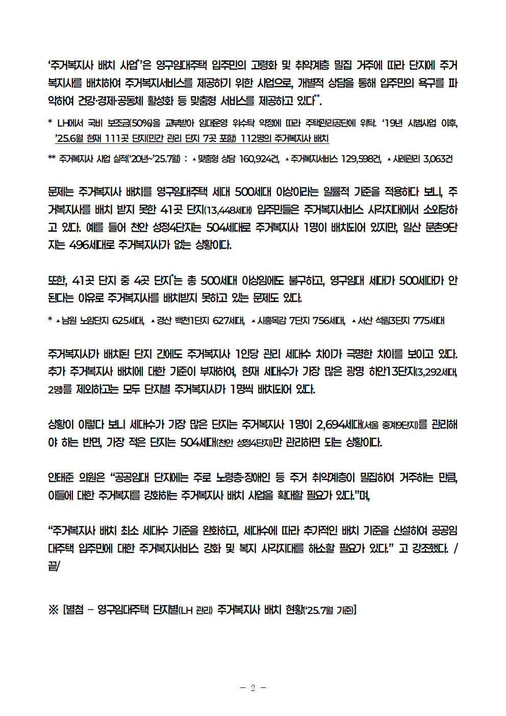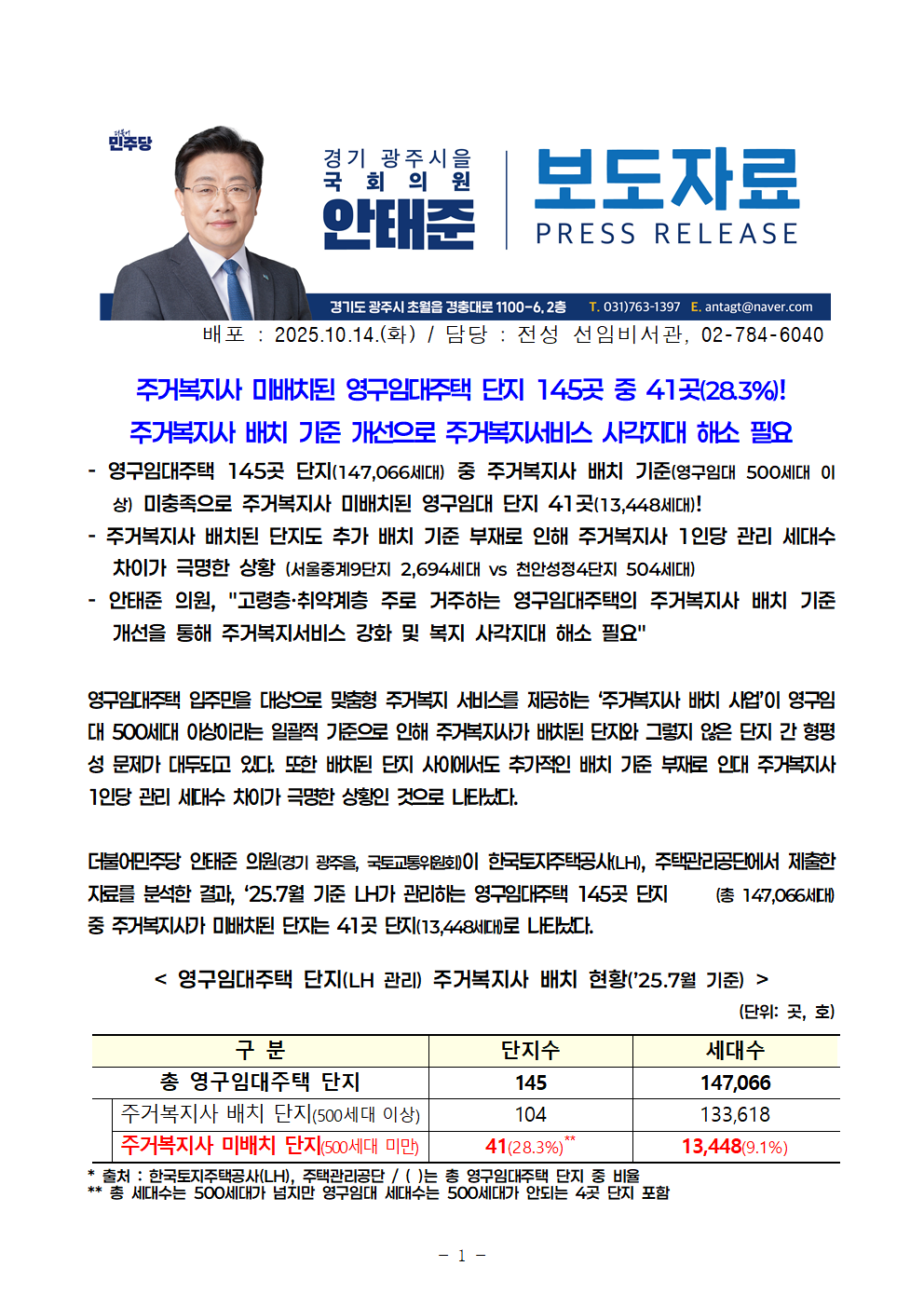 251014 (안태준 의원 보도자료) 5. 주거복지사 미배치 영구임대주택 단지 145개 중 41개(28.3%)!)!.hwp