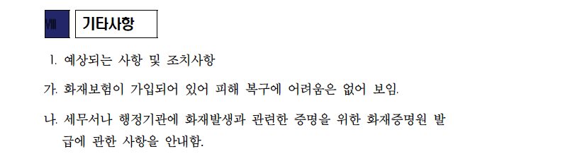 통상적으로 화재보험에 가입되어 있다는 이유로 ‘피해복구에 어려움이 없다’고 기재되진 않는다. 실제 의원실이 소방청에 문의한 결과, “피해보상금으로 충분한 피해복구가 가능하다는 판단하에 기재한 것”으로 확인했다.
