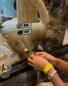 (사진 설명) 사진2 코아티에게 맨손으로 먹이를 지급하는 모습(출처: (사)동물복지연구소 어웨어)