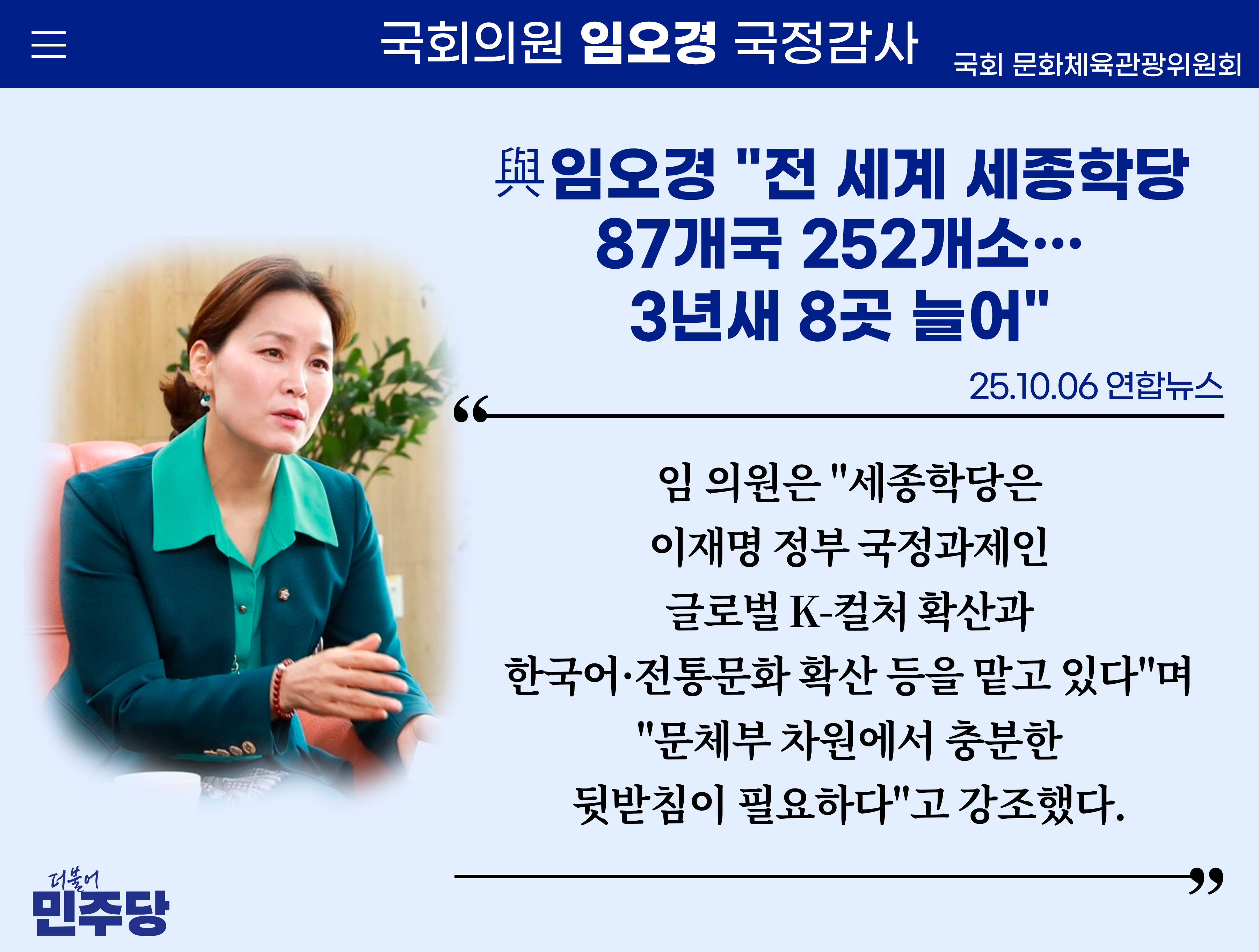 [임오경 카드뉴스]연합뉴스 / 與임오경 "전 세계 세종학당 87개국 252개소…3년새 8곳 늘어"