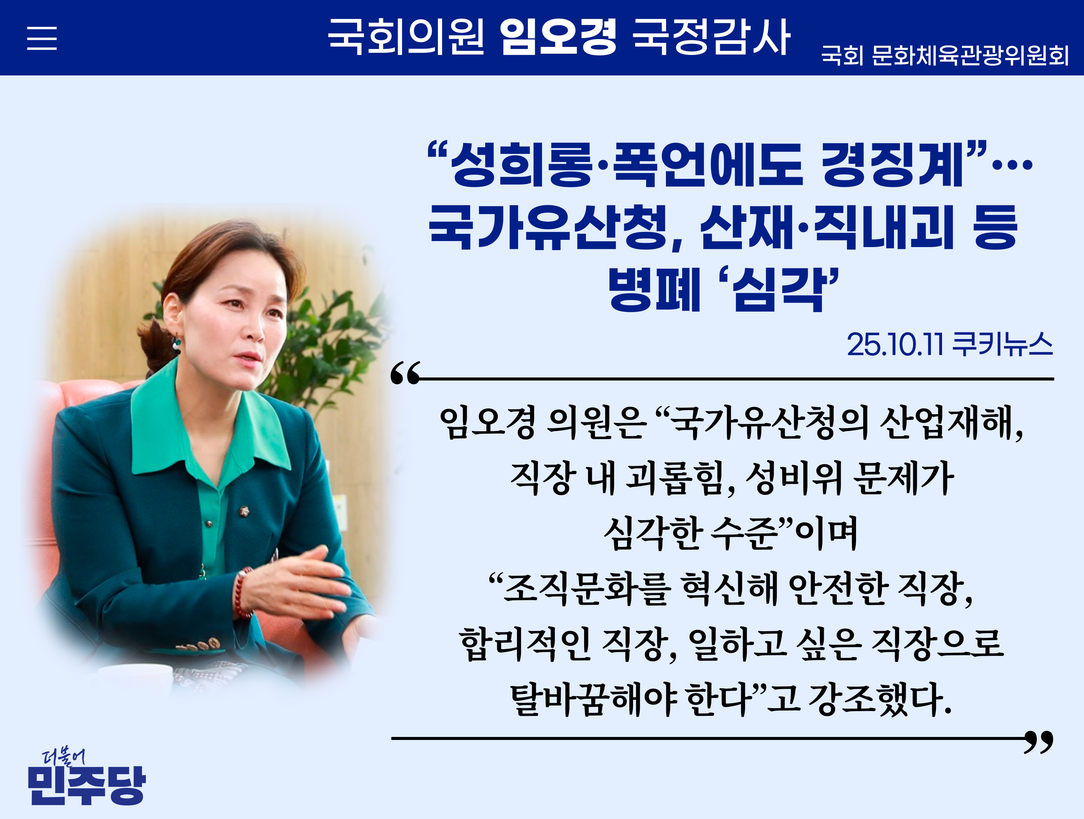 [임오경 카드뉴스]쿠키뉴스 / [단독] “성희롱·폭언에도 경징계”…국가유산청, 산재·직내괴 등 병폐 ‘심각’