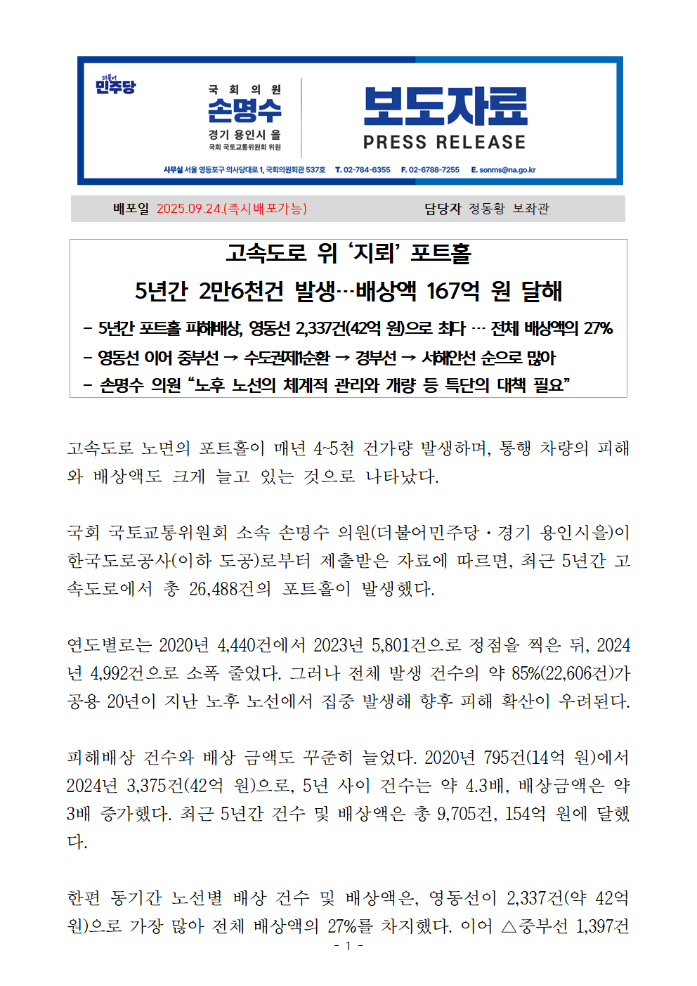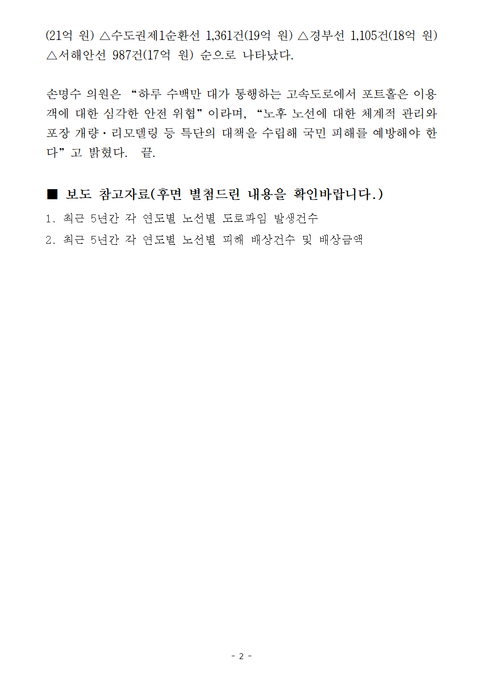 [국회의원 손명수 보도자료] 고속도로 위 ‘지뢰’ 포트홀 5년간 2만6천건 발생…배상액 167억 원 달해
