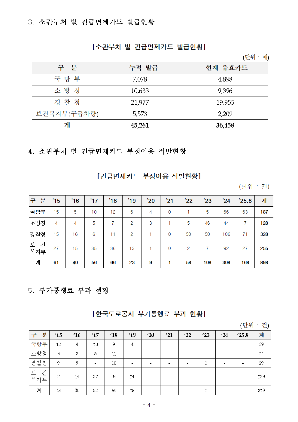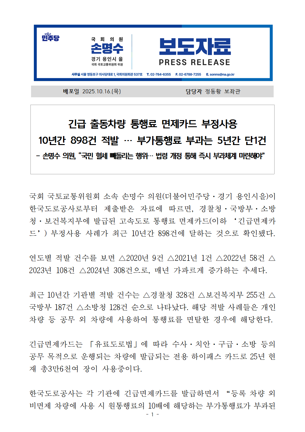 [국회의원 손명수 보도자료] 긴급 출동차량 통행료 면제카드 부정사용 10년간 898건 적발 … 부가통행료 부과는 5년간 단1건