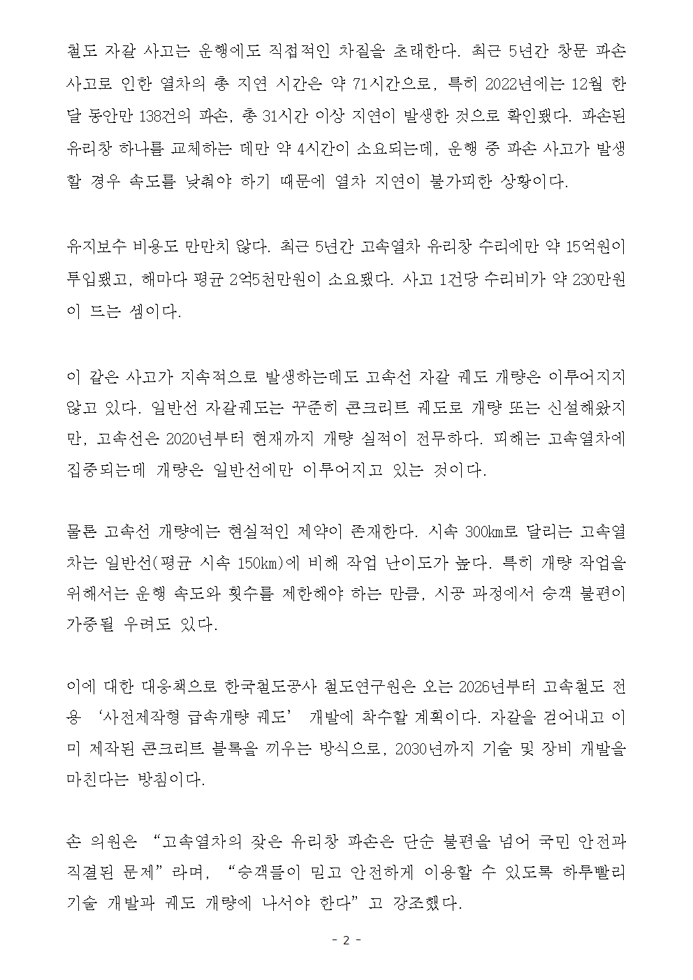[국회의원 손명수 보도자료] 철도 자갈 바닥, 승객 안전을 위협한다... 5년간 자갈로 인한 고속열차 유리창 파손 663건