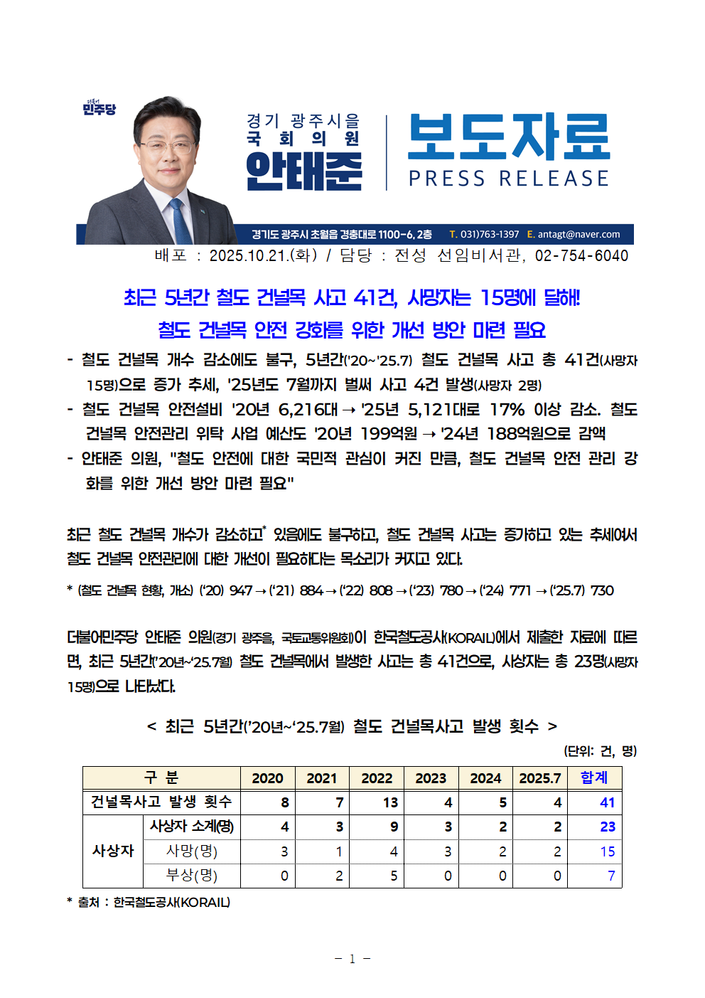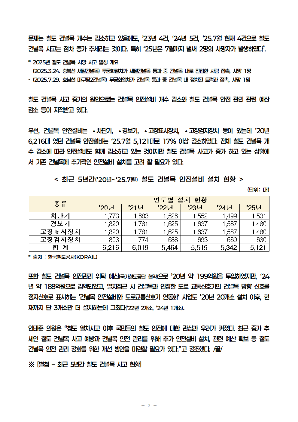 251021_안태준_의원_보도자료_5년간_철도_건널목_사고_41건_사망자도_15명.hwp