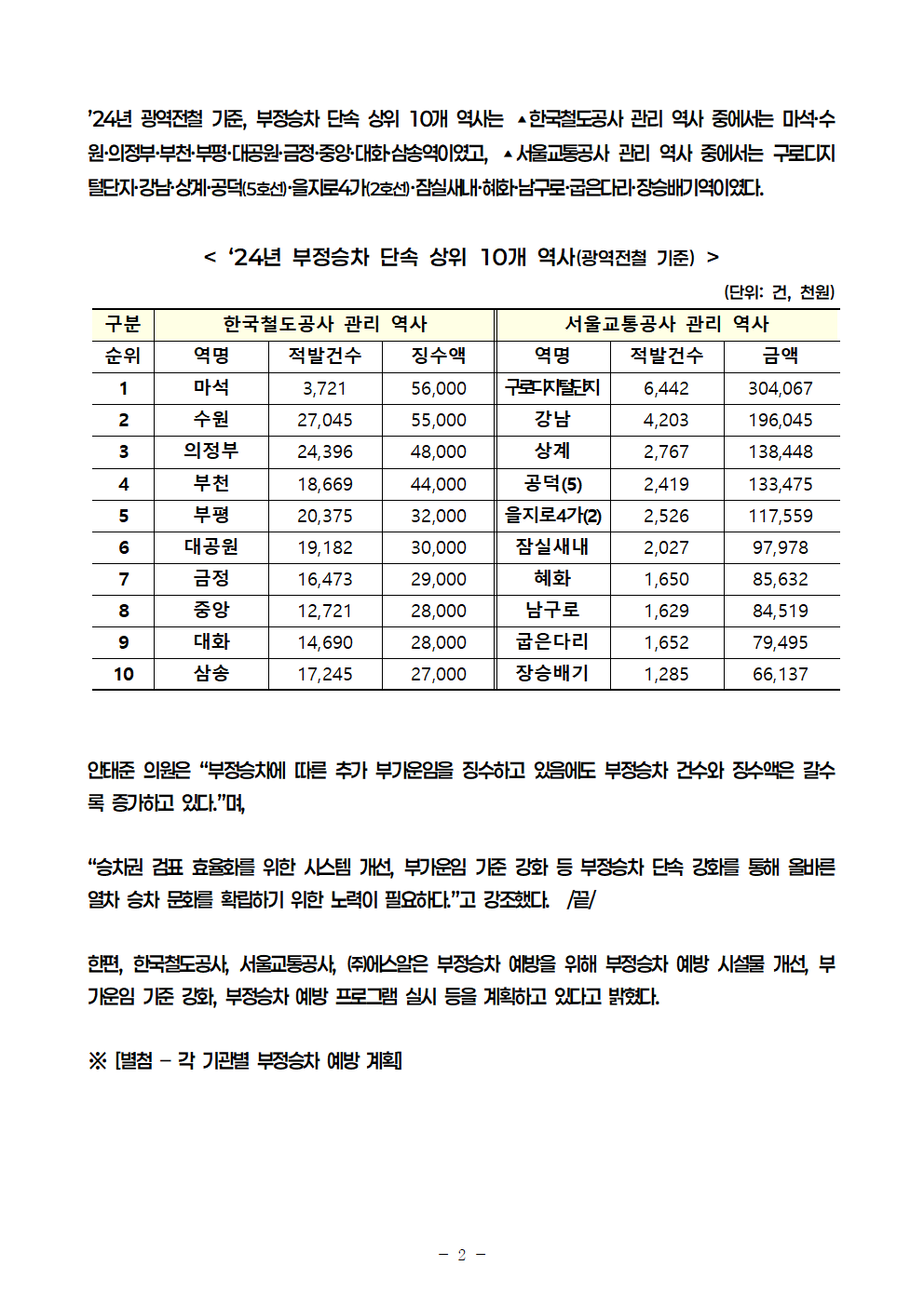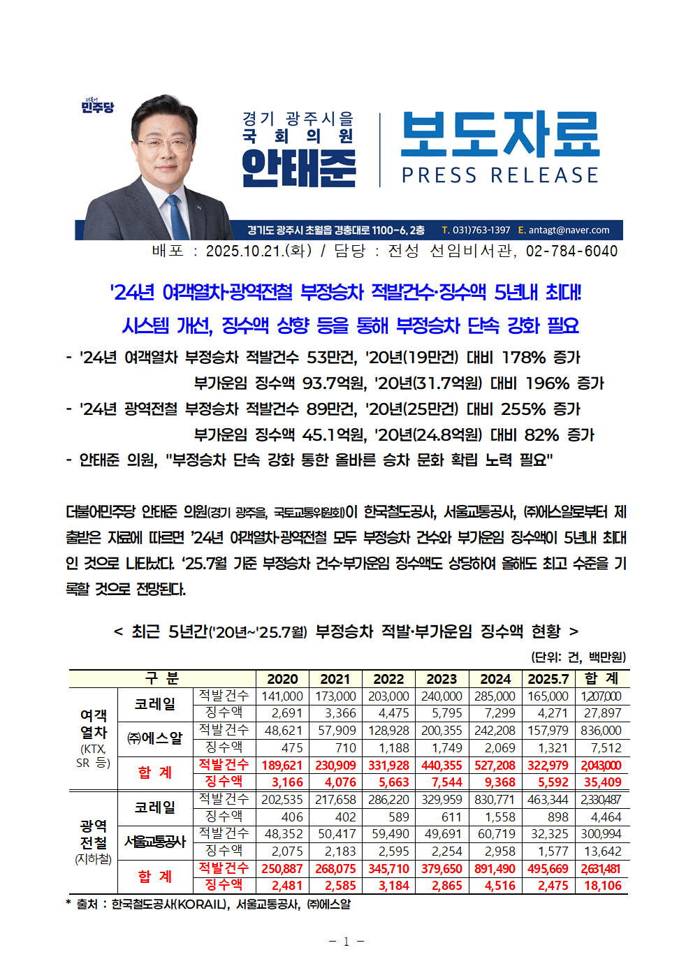 251021_안태준_의원_보도자료_작년_열차전철_부정승차_적발_5년내_최대!.hwp