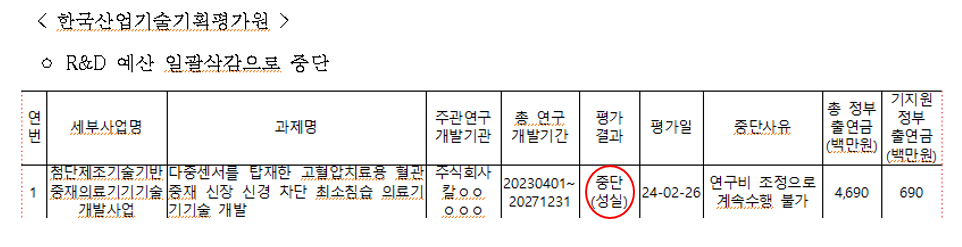 <산기평 2024년 R&D예산 일괄삭감 따른 중단현황>