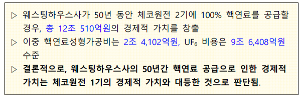 특히 자료집에 따르면, 체코 원전 2기에 50년간 핵연료를 공급할 경우 총 12조 510억 원의 경제적 가치가 창출되는 것으로 나타났다. 그러나 한수원과 웨스팅하우스가 맺은 합의에 체코, 사우디아라비아에는 웨스팅하우스가 핵연료를 100% 공급한다는 조항이 포함돼 있어, 이 12조 원의 경제적 가치를 웨스팅하우스에 전부 내어줄 수 있다는 분석이다.