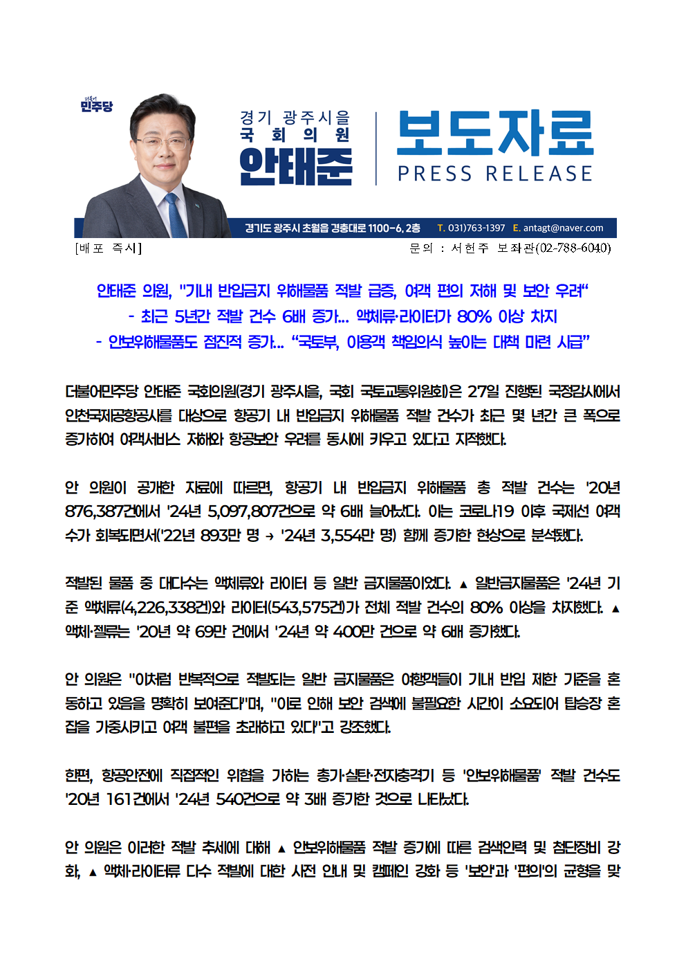[안태준 의원 보도자료] 안태준 의원, "기내 반입금지 위해물품 적발 급증, 여객 편의 저해 및 보안 우려"