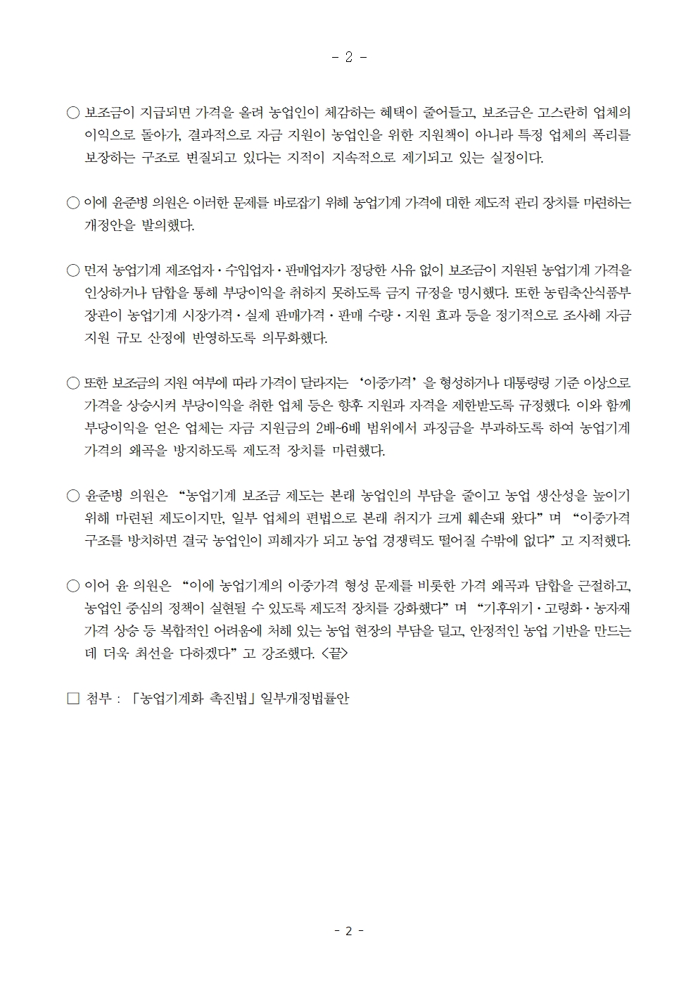 250922 [윤준병 의원 국정감사 보도자료] 윤준병 의원 국가 보조금 지원액만큼 가격 올려 폭리 취하는 농기계업체 적발해야.hwp