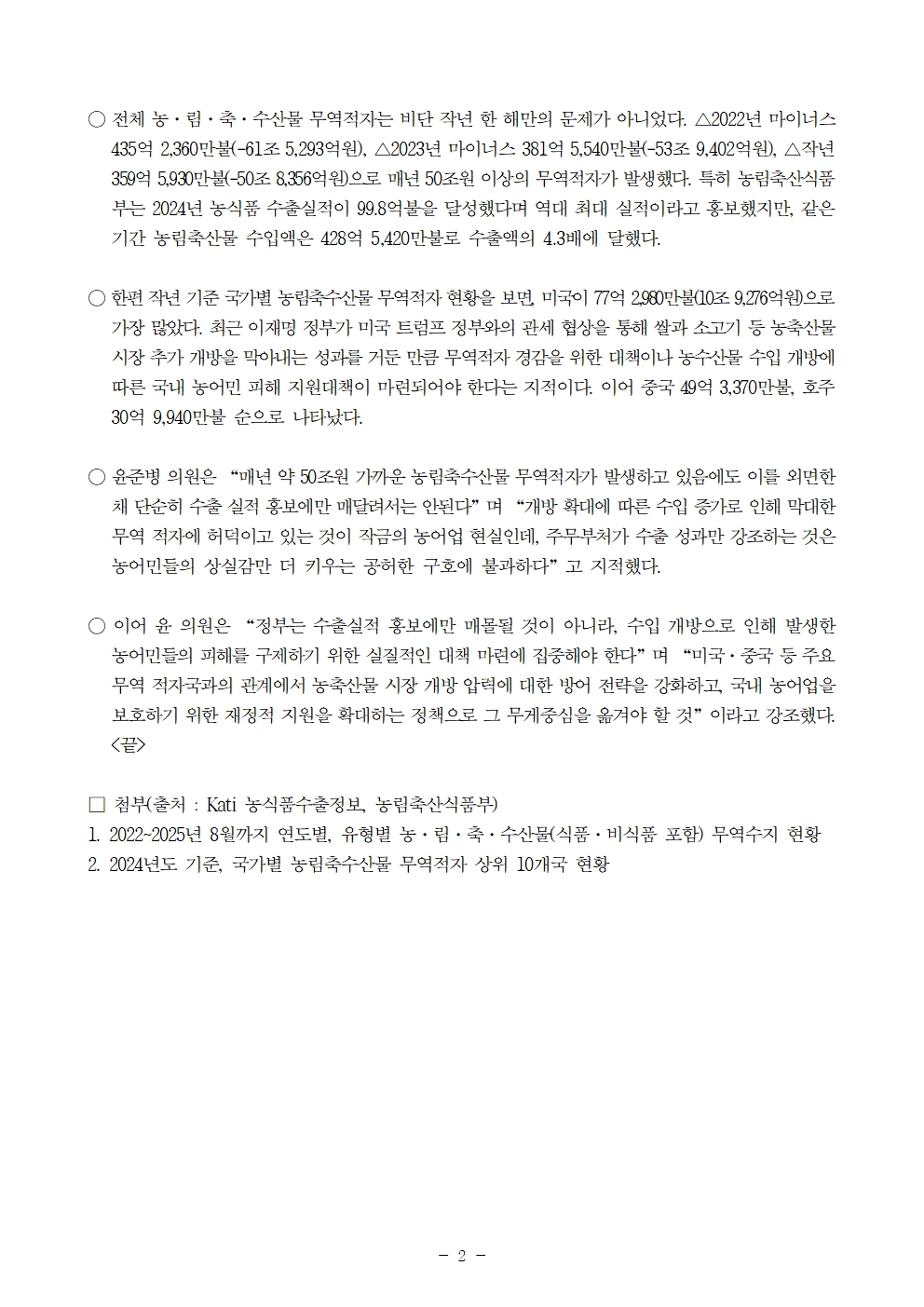 251013 [윤준병 의원 국정감사 보도자료] 매년 50조원 농수산물 무역적자 외면하고 농수산식품 수출실적만 홍보.hwp