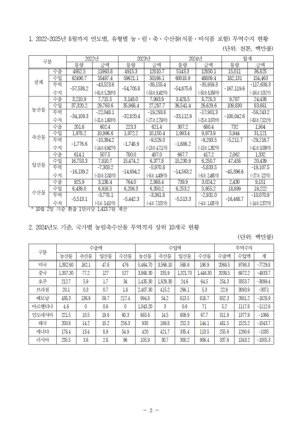 [윤준병 의원 국정감사 보도자료] 매년 50조원 농수산물 무역적자 외면하고 농수산식품 수출실적만 홍보